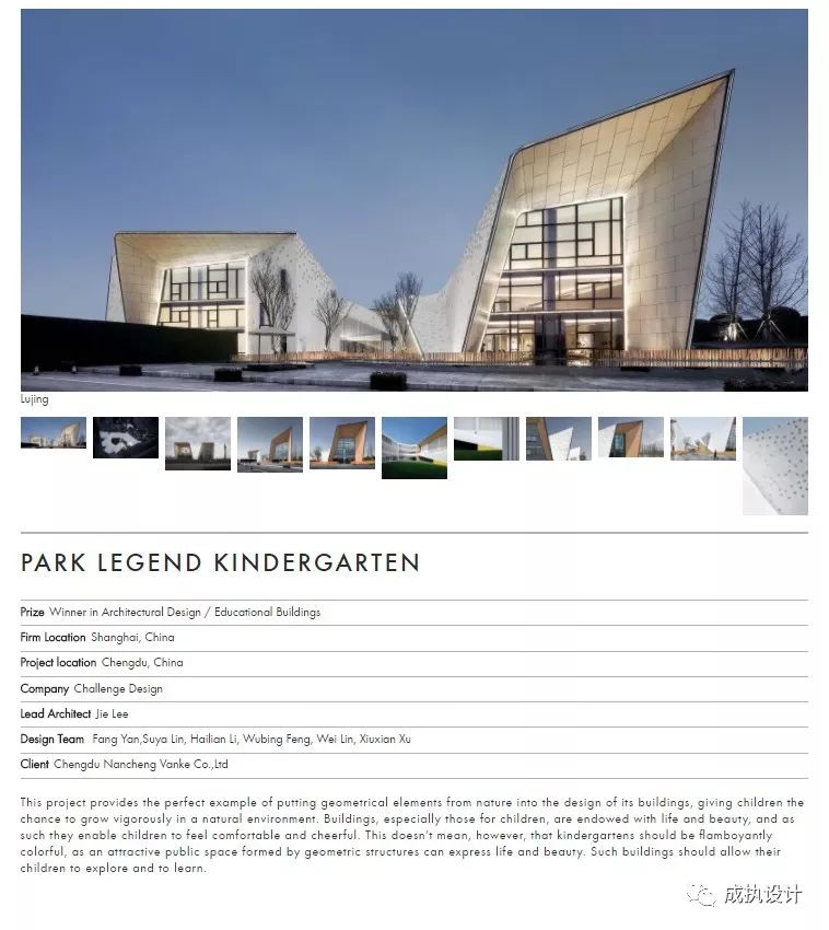 42 categories. Chengdu Vanke Park Legendary Kindergarten by Challenge Design has been awarded in Architectural Design- Educational Buildings category.AMP兩年一度的頒獎(jiǎng)典禮將于2019年在西班牙畢爾巴鄂古根海姆博物館舉行,我司作為獲獎(jiǎng)?wù)弑谎?qǐng)參與典禮并向全球觀眾展示本次獲獎(jiǎng)作品,敬請(qǐng)期待頒獎(jiǎng)盛況。The