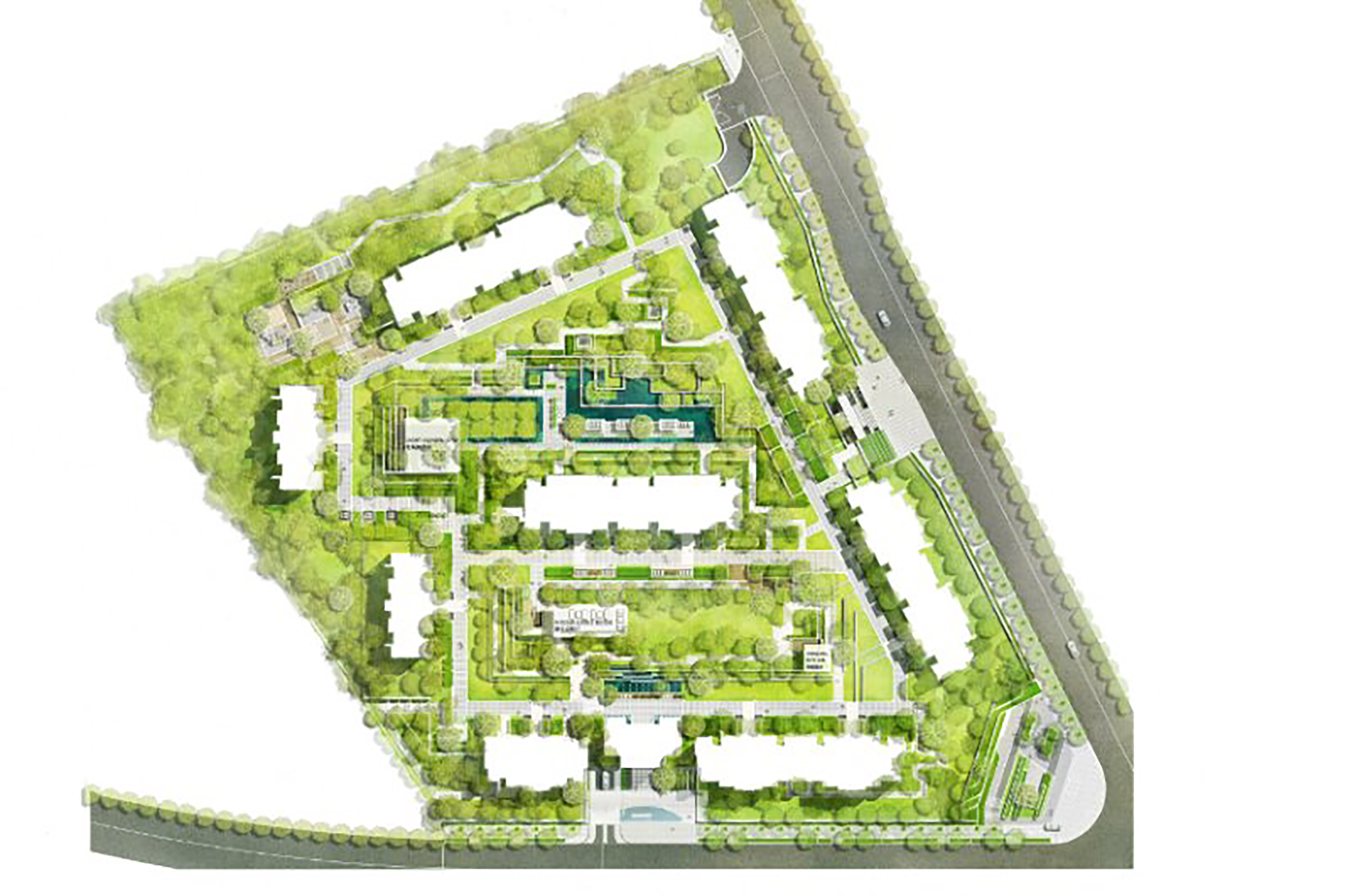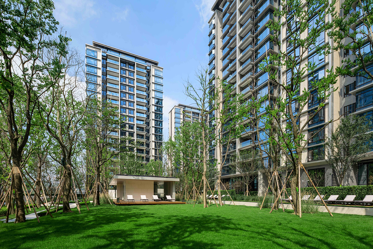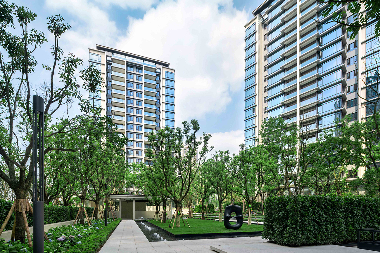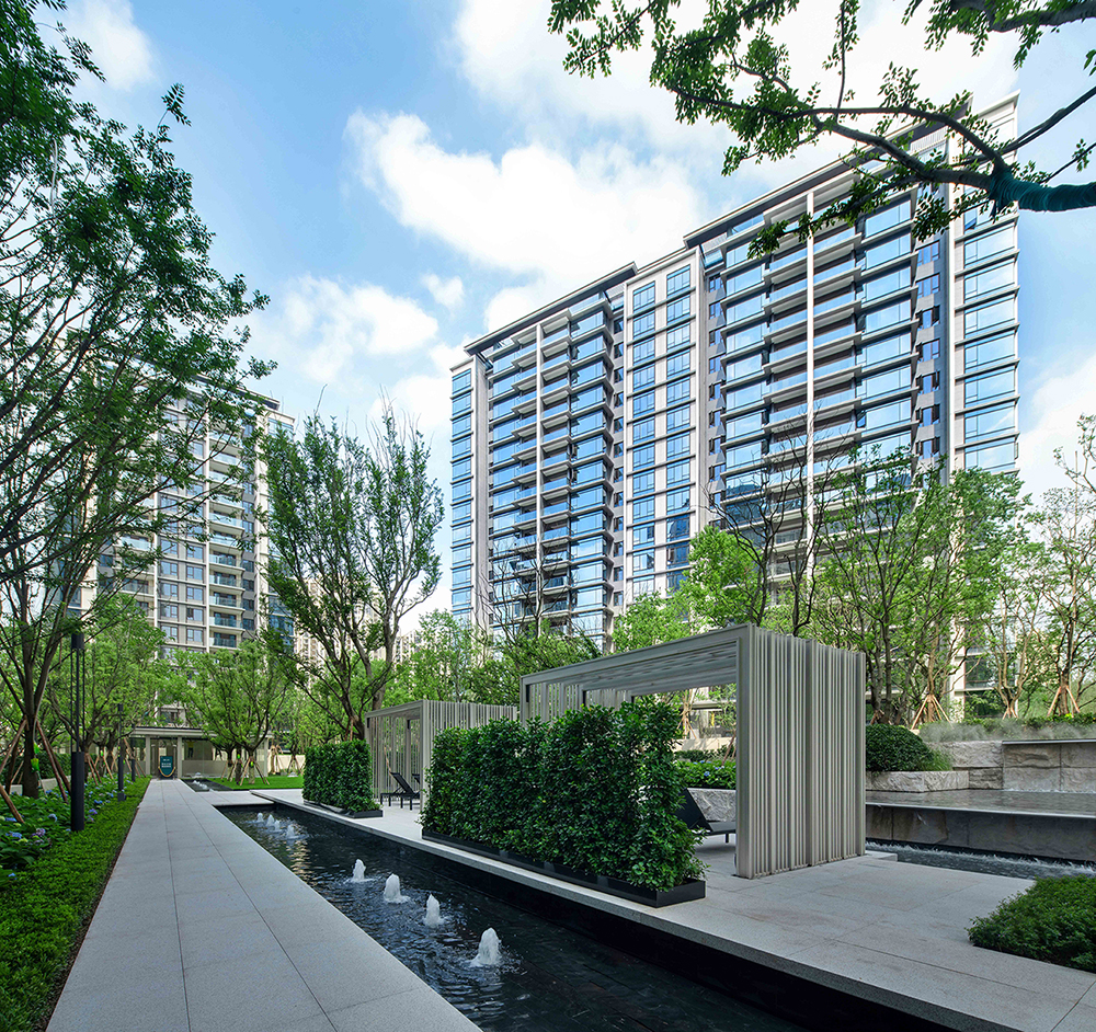 入口大門約5米高,兼以黑白大理石,盛啟森鏡門第之儀。開放水景等簡約現(xiàn)代設(shè)計,外圍擋墻采用2+1+1隔離布局,自稱高墻秘境,城囂隔絕門外,身心回歸森林秘境。