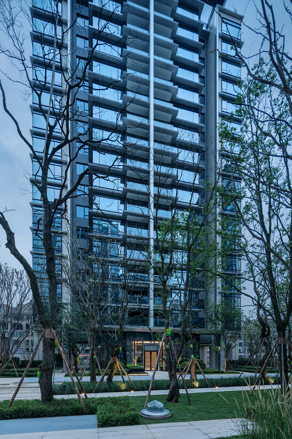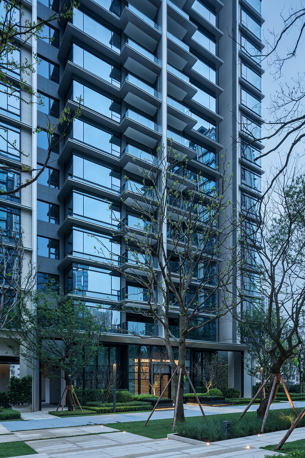 用純粹、干凈的立面處理手法、輔以精致的細(xì)節(jié)把控。通過門頭、屋頂、墻身、陽臺、線腳等精細(xì)化設(shè)計,嚴(yán)控立面節(jié)點,最終的建筑立面呈現(xiàn)出一種儒雅又不失風(fēng)骨的氣質(zhì)。