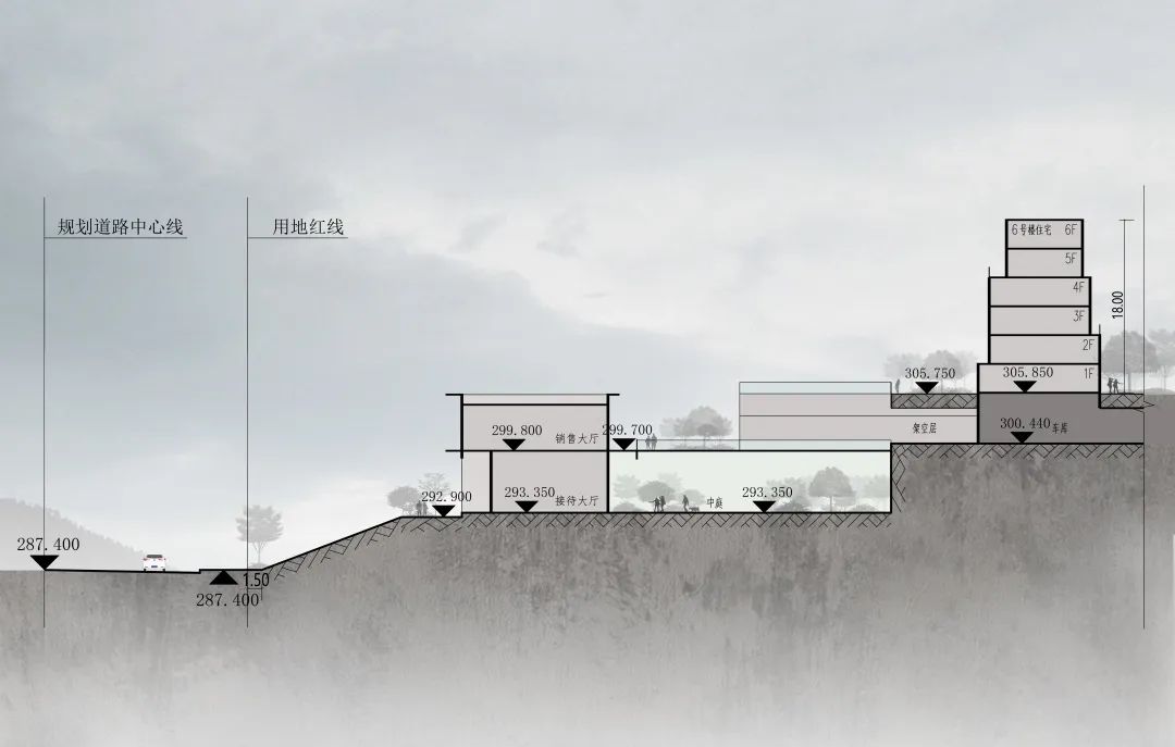 本案依山而筑,場地南北向高差約17米,東西向高差高達35米。基于場地條件,地塊臨嘉瑞大道西側(cè)為體驗中心的最佳且唯一的城市接駁點和人流導(dǎo)入點。利用地形高差,展示區(qū)與城市道路及樣板樓形成高差錯落的山地庭院景觀,鑒于周邊現(xiàn)狀條件的復(fù)雜性,我們認為采用“隱”是該項目規(guī)劃設(shè)計策略中主要處理手法。設(shè)計中在前場空間采用半圍合私密庭院來減少城市干道對于住區(qū)的干擾。
