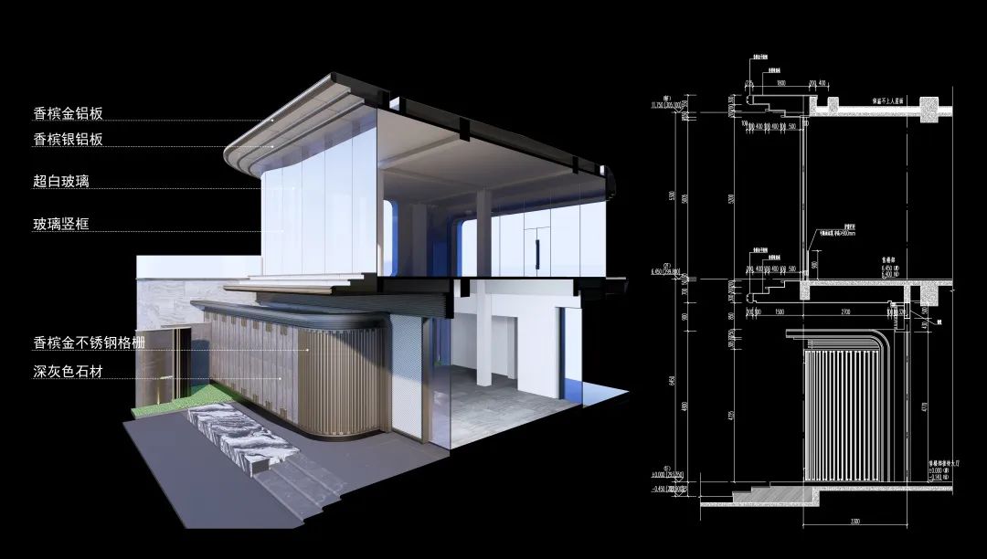 入口立面造型相比于單純的無銹鋼的材質(zhì),石材與無銹鋼相結(jié)合,利用無銹鋼作為條形格柵,使其更精致,呈現(xiàn)效果更均質(zhì)。幕墻頂部的有懸挑近兩米,雙曲面弧形收口處理,也是細節(jié)難點。