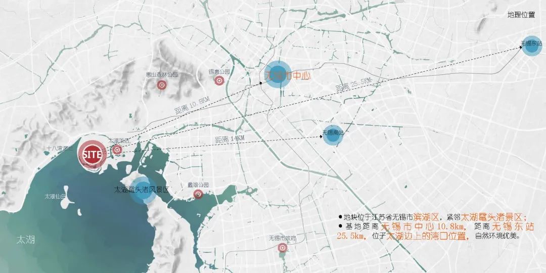 本案位于江蘇省無(wú)錫市濱湖區(qū),南臨太湖,景區(qū)聚集,湖山資源豐富,自然環(huán)境優(yōu)美。空氣質(zhì)量極佳,堪稱生態(tài)綠肺,天然氧吧。沿環(huán)太湖公路車程約40分鐘可達(dá)市區(qū),距地鐵2號(hào)線1.6km,車行交通較為方便。