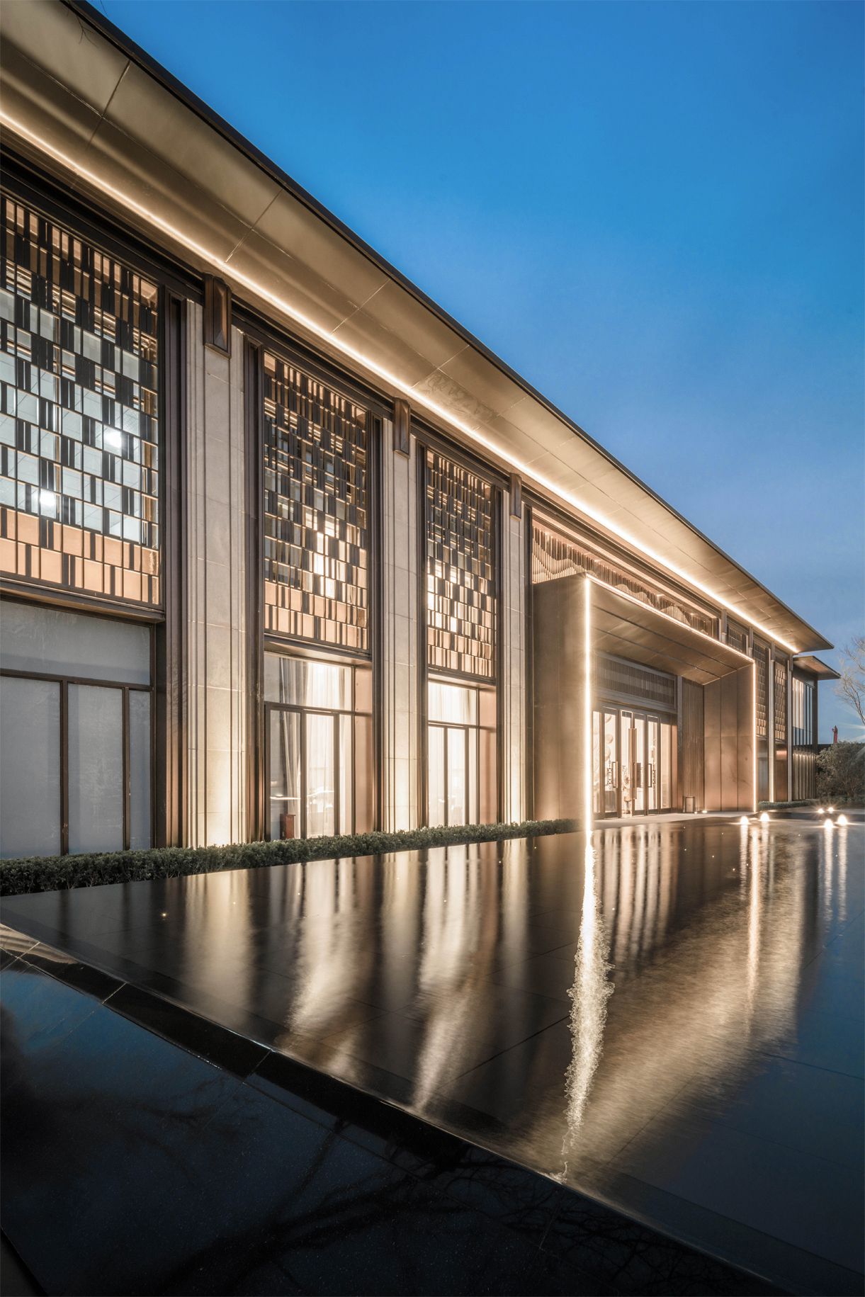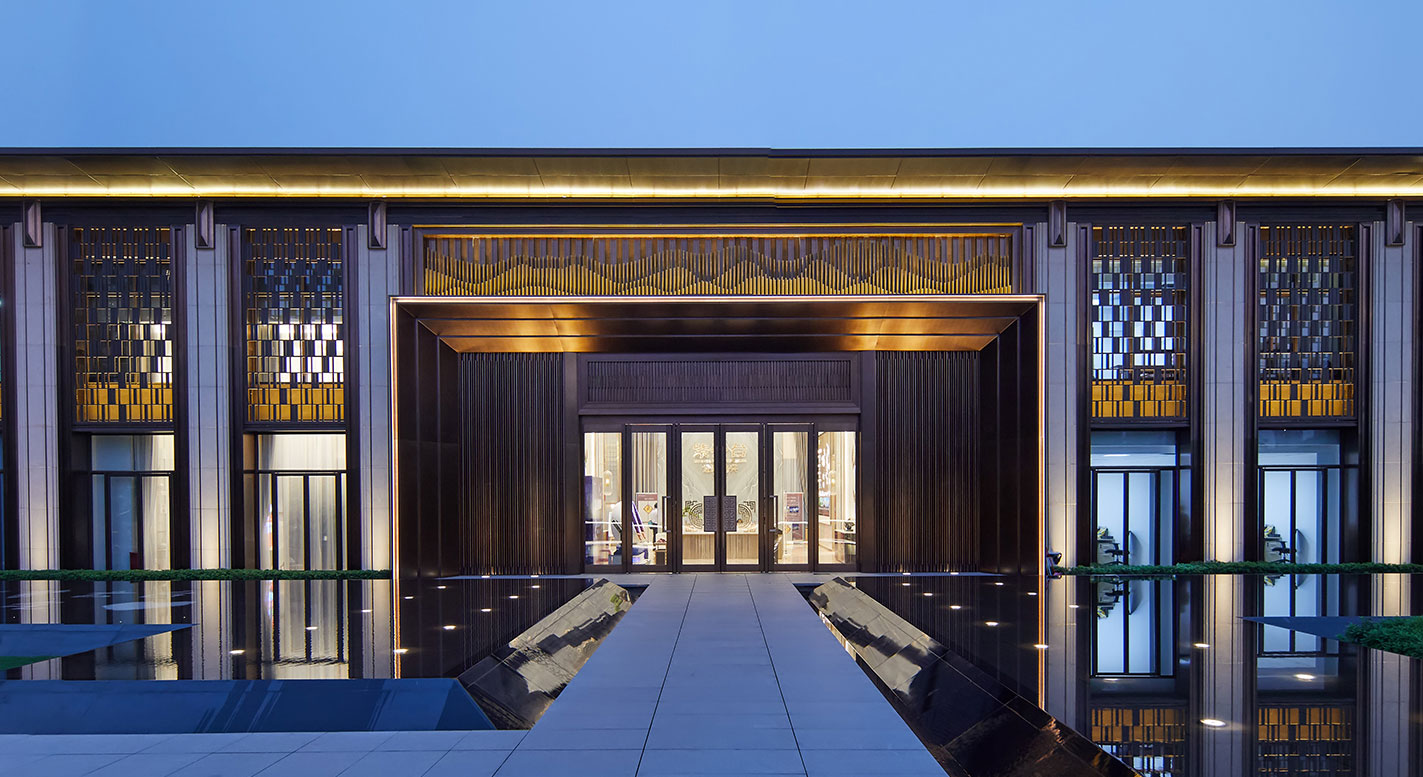 建筑形制提取古建筑的中軸對稱開間的元素,遞進有序。以銅制裝飾柱形成纖細(xì)的柱廊序列,賦予生活莊嚴(yán)大美的儀式感,禮賢有序的禮制之美。不僅一梁一柱都要進行藝術(shù)加工,著力于建筑細(xì)部的刻畫,并且對于裝飾更是細(xì)致處理。