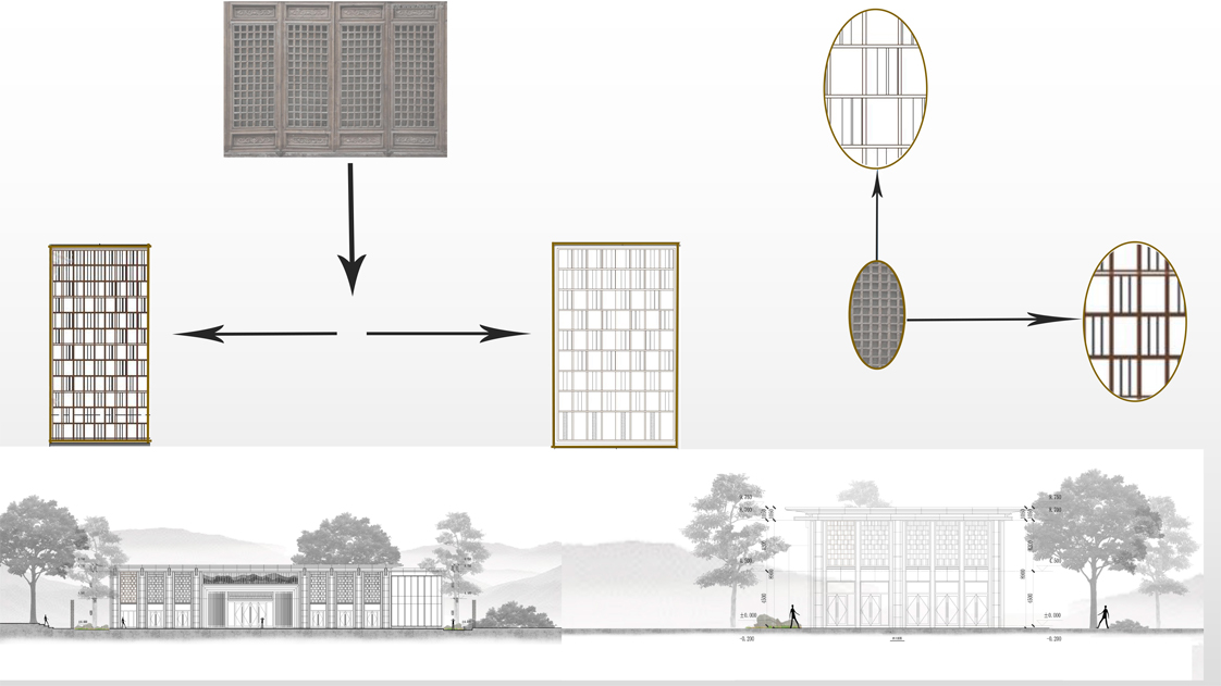 采用重檐的方式來強調(diào)建筑的尊貴感,追求建筑的比例,運用現(xiàn)代手法簡化繁復(fù)的屋頂形式。靈活運用“屋檐起翹”的原理,用反向弧形塑造輕盈之感。