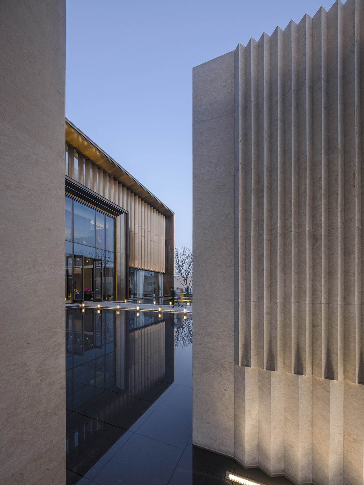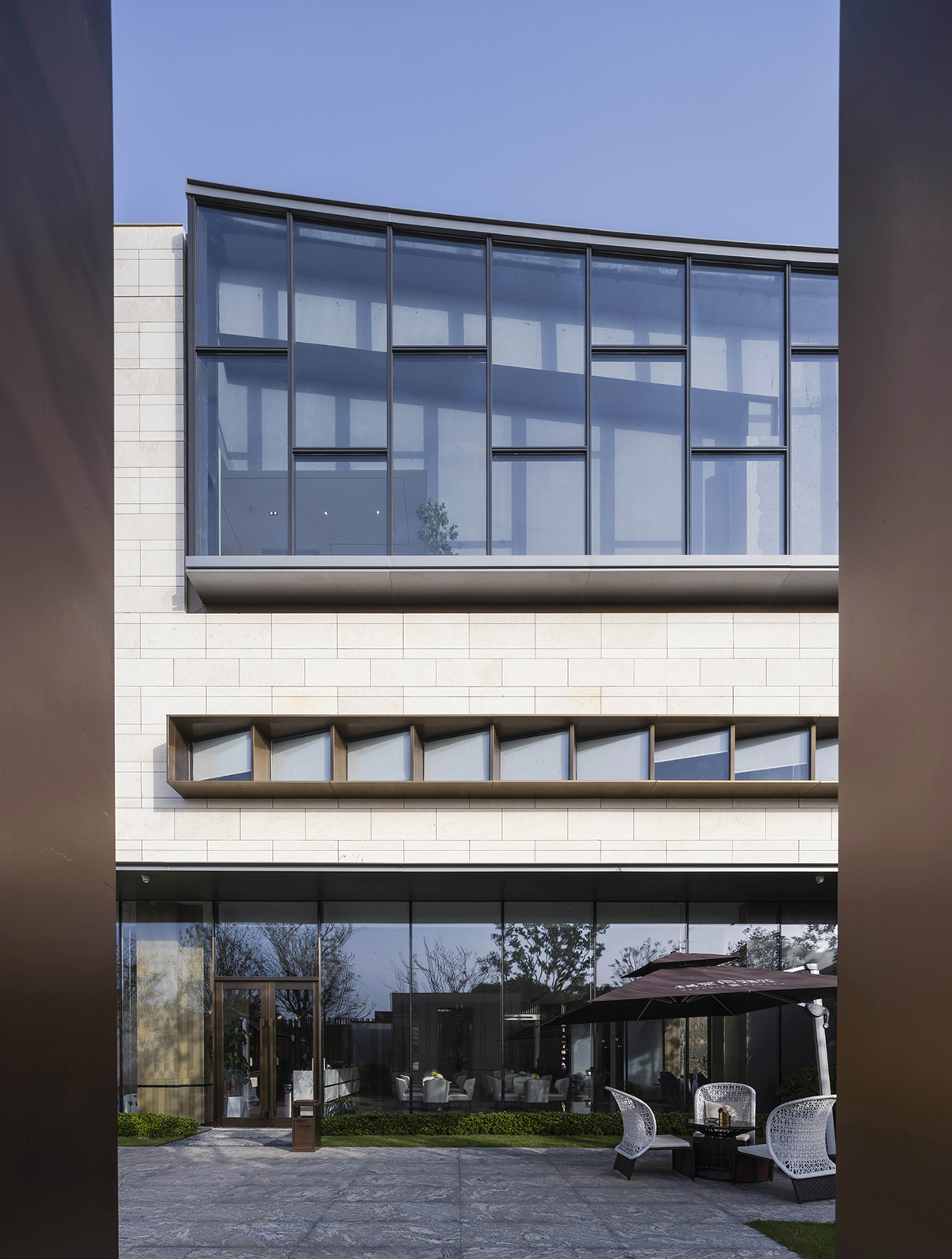 傳統(tǒng)的蘇州是清雅的,小橋流水人家;現(xiàn)代的蘇州又是熱烈的,準(zhǔn)一線城市,年輕又時(shí)尚。蘇州這座城市的精神特質(zhì)是既傳統(tǒng)又現(xiàn)代,既清雅又熱烈。 ??? 在建筑立面的材質(zhì)選擇上,也著力體現(xiàn)這種雙重性。建筑以淺米色溫潤石材為表皮,包裹內(nèi)側(cè)香檳色仿銅鋁板,在輕與重、明與暗、淡雅與濃烈之間形成強(qiáng)烈的反差對比,建筑的張力由此彰顯。