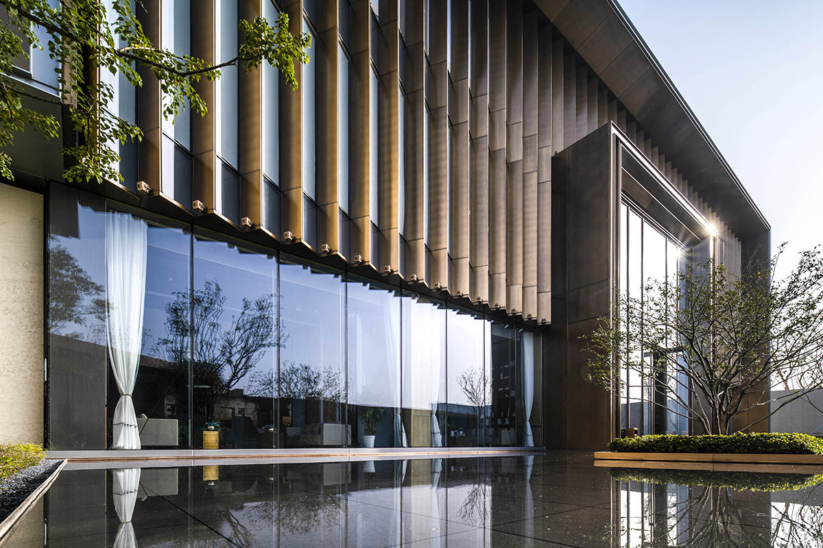 仿銅鋁板與玻璃成折板組合,一側(cè)硬朗,一側(cè)通透,構(gòu)成另一重反差對比。折板在建筑主立面上如一把折扇打開,形成明暗和色彩的韻律組合。建筑一層為展示大廳,二層為辦公,三層為樣板房,為保證樣板房的自然采光通風(fēng),南側(cè)做了局部露臺??紤]到后期商業(yè)立面的整體性,露臺南側(cè)做了折板通高處理。