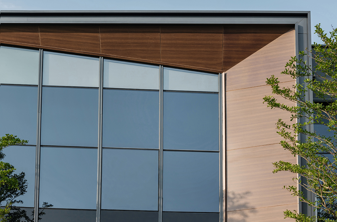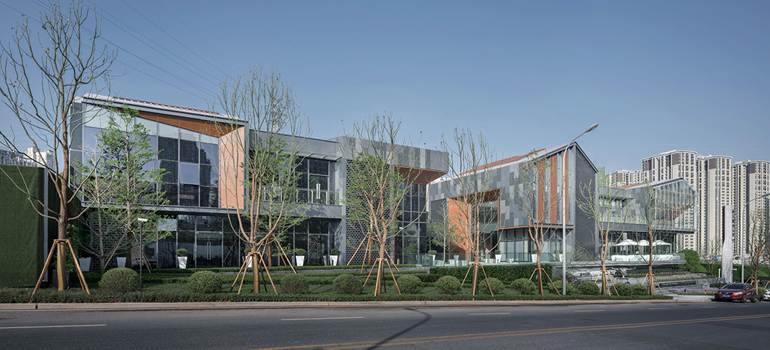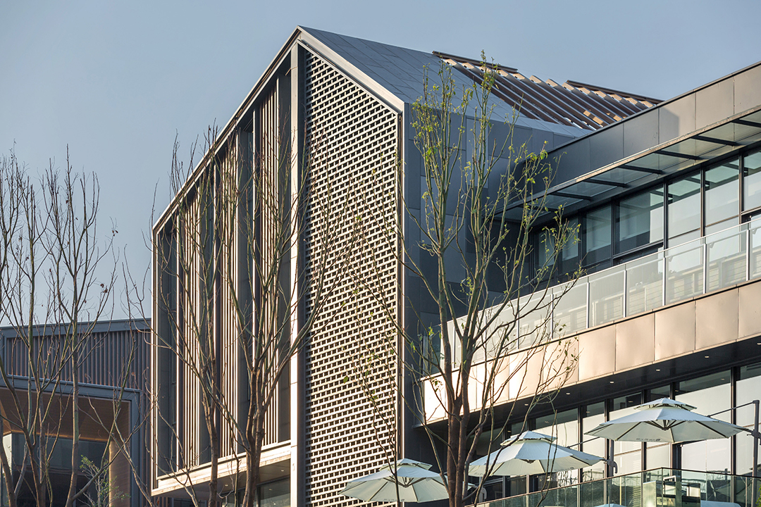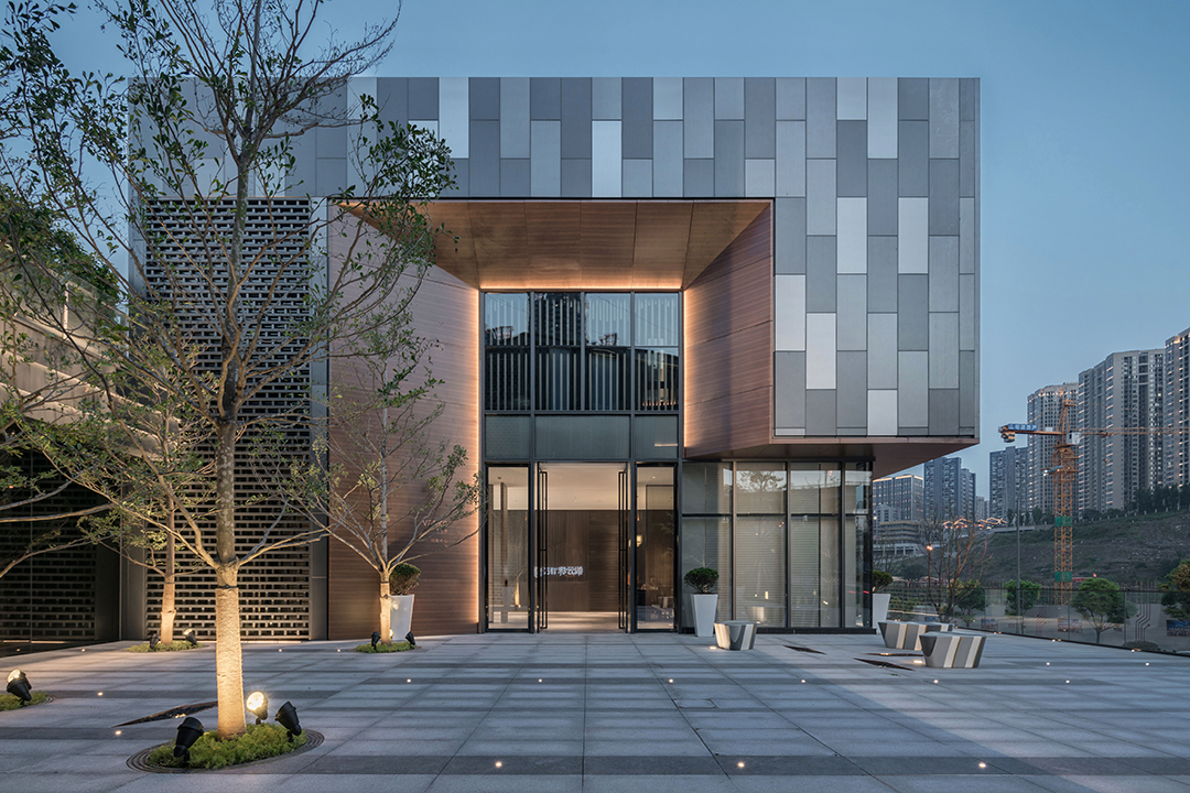 拼色鋁板是森林抽象的表達,模擬各種樹木的穿插與錯落感,有高有低,有深有淺。豐富了立面的材質(zhì)肌理,又能與體量和尺度共棲。