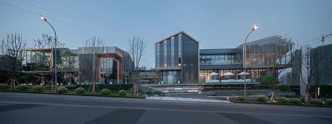 東側(cè)為集中商業(yè)主要形象入口,主入口位于建筑轉(zhuǎn)角,擁有更為廣闊的城市展示角度,形態(tài)上折面內(nèi)收,有納入之感,焦點式的穿孔鋁板肌理宛若面紗具有通透性,以開放的姿態(tài)將人流引入中庭。