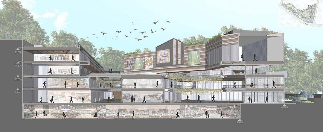 建筑是圍合空間的藝術(shù),利用場地近15米的高差,設(shè)計穿越式三維空間動線,打造多首層商業(yè)空間,移步異景的森林花園,形成獨特的景觀型商業(yè)。