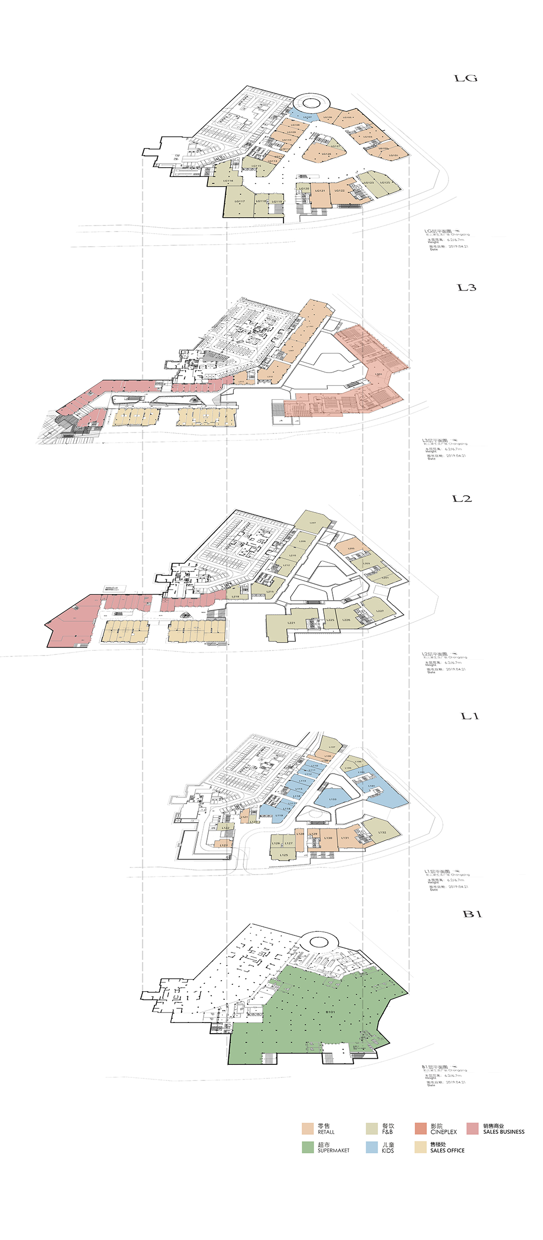 西側(cè)入口近400平米的前廣場,規(guī)劃了更多的城市與建筑的界面,臨近幼兒園,以老人及小孩為客戶主體,模糊城市空間與綜合體的界限,加強功能之間的相互支撐,帶動街區(qū)活力。