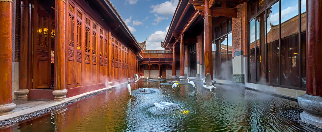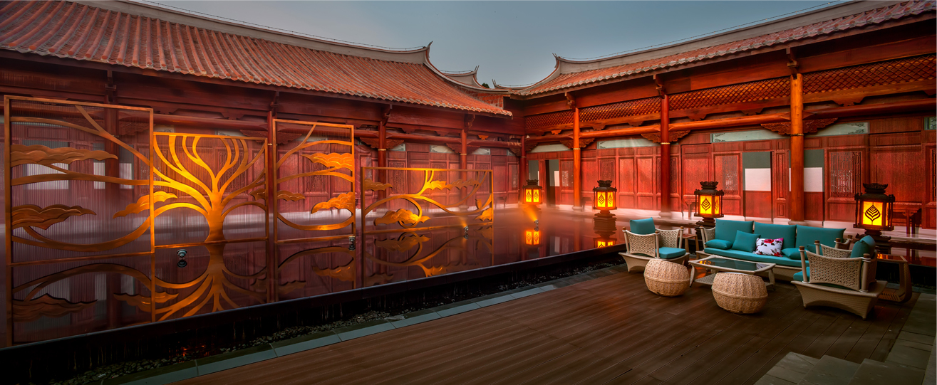 項(xiàng)目位于紫湖水庫(kù)的西北面,有“紫帽凌霄”之譽(yù),緊鄰紫帽山風(fēng)景區(qū),坐落在晉江市的北側(cè)。酒店的建筑立面參考了泉州當(dāng)?shù)氐墓偈酱筘龋浞诌\(yùn)用了燕尾脊,紅磚墻,青石等傳統(tǒng)建筑元素。木材與石材為主要的建筑材料,成功運(yùn)用其特性,體現(xiàn)了對(duì)地方建材的尊重。通過(guò)“厝”與“院”的提取和重組,創(chuàng)造出一種具有閩南意味的中式空間。
