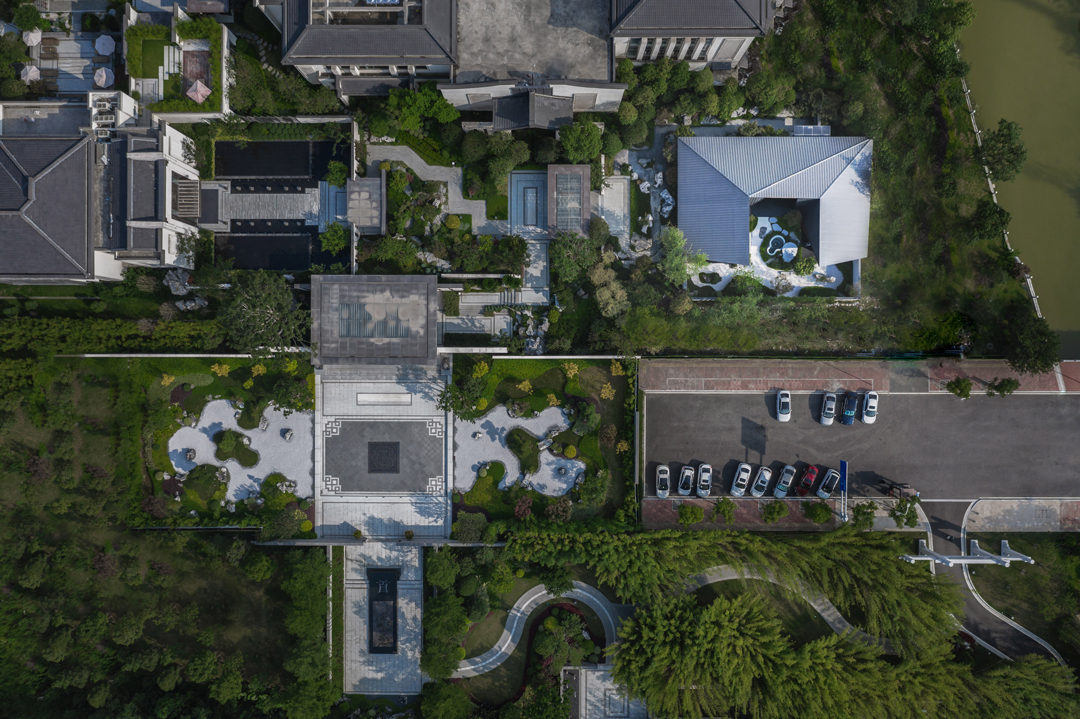 “和、敬、清、寂”是東方文化的精神內(nèi)涵,溫泉會(huì)館延續(xù)了螺洲傳統(tǒng)的建筑風(fēng)格,以古鎮(zhèn)為肌理,采用院落形式,對(duì)稱式布局。用現(xiàn)代手法突破傳統(tǒng)的四坡屋面,以折線打造五坡,開口折向屋頂落于地面,形成廊道。水療SPA與餐廳的屋頂則沿襲古建中的大挑檐,卻以更為簡(jiǎn)單樸素的方式呈現(xiàn)。