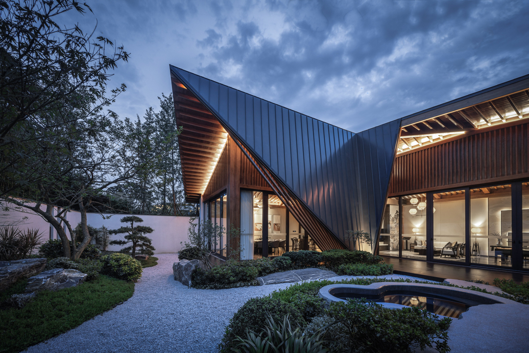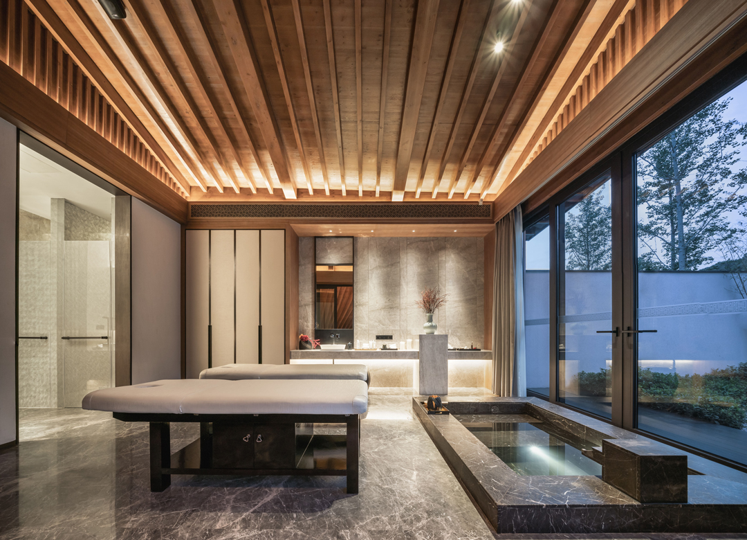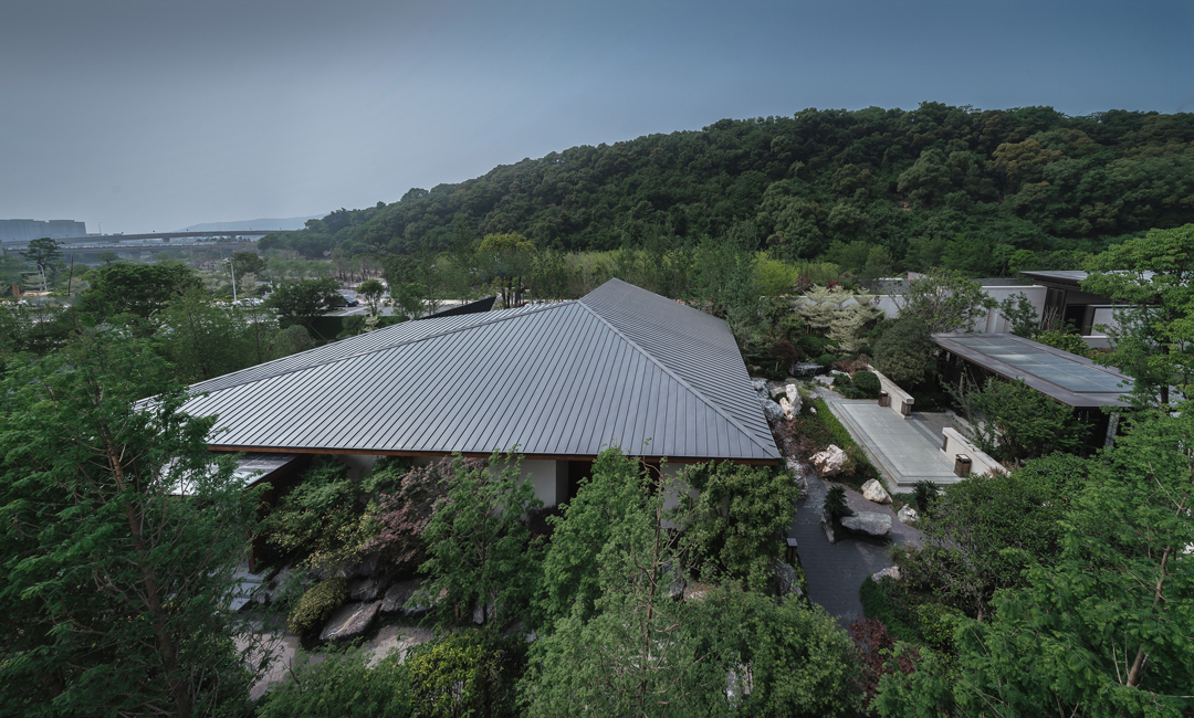整個(gè)建筑空間層層漸變,屋頂高度根據(jù)功能空間的不同而變換,SPA作為最為私密的空間,屋頂落低,但動(dòng)與靜互為補(bǔ)充,相輔相成。