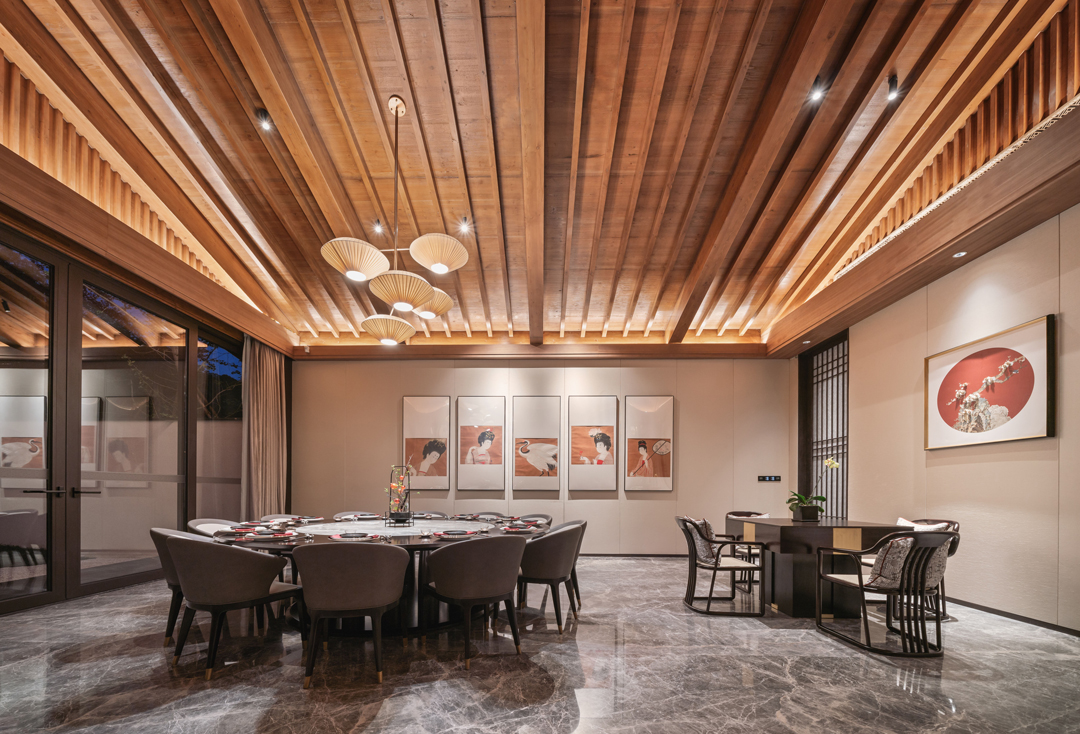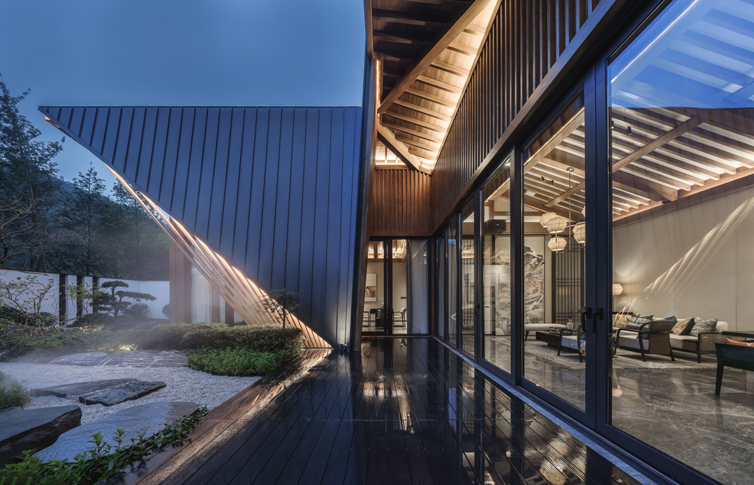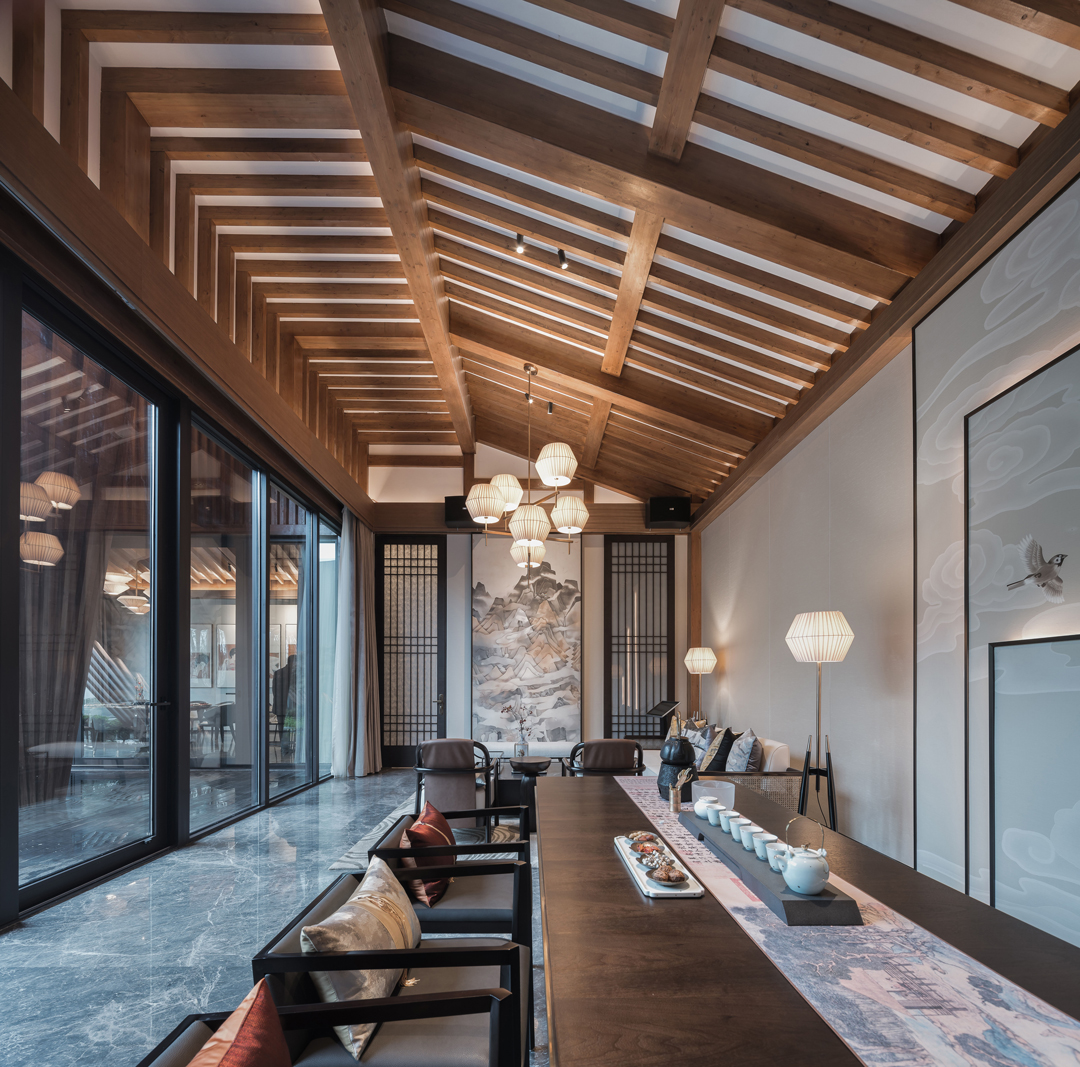 用玻璃與木格柵分割室內(nèi)外空間,引導(dǎo)視線,借以北側(cè)遠(yuǎn)山,分別形成三面框景。無聲、有光、有影,建筑元素越是接近世界的本原,人越能與空間產(chǎn)生共鳴,皆在營(yíng)造鬧中取靜的空間氛圍。