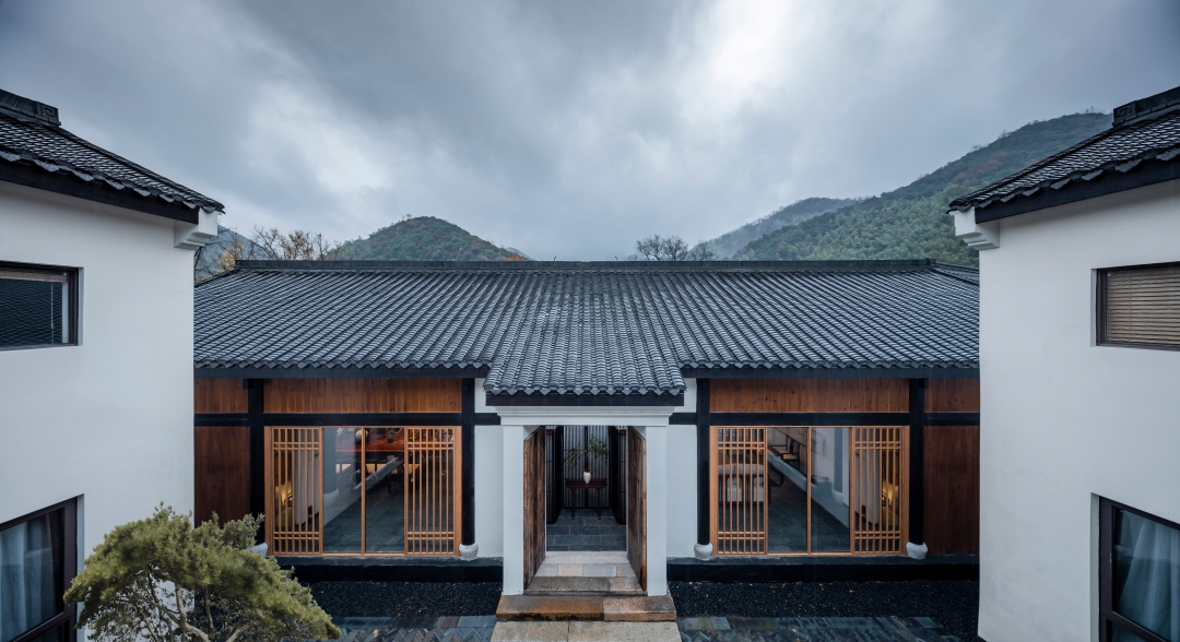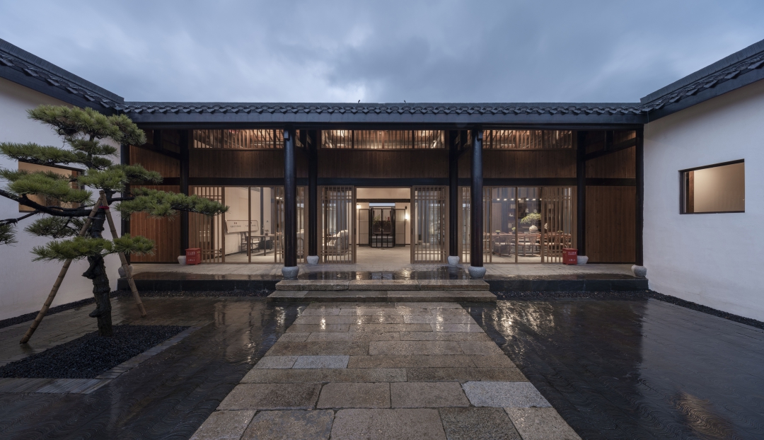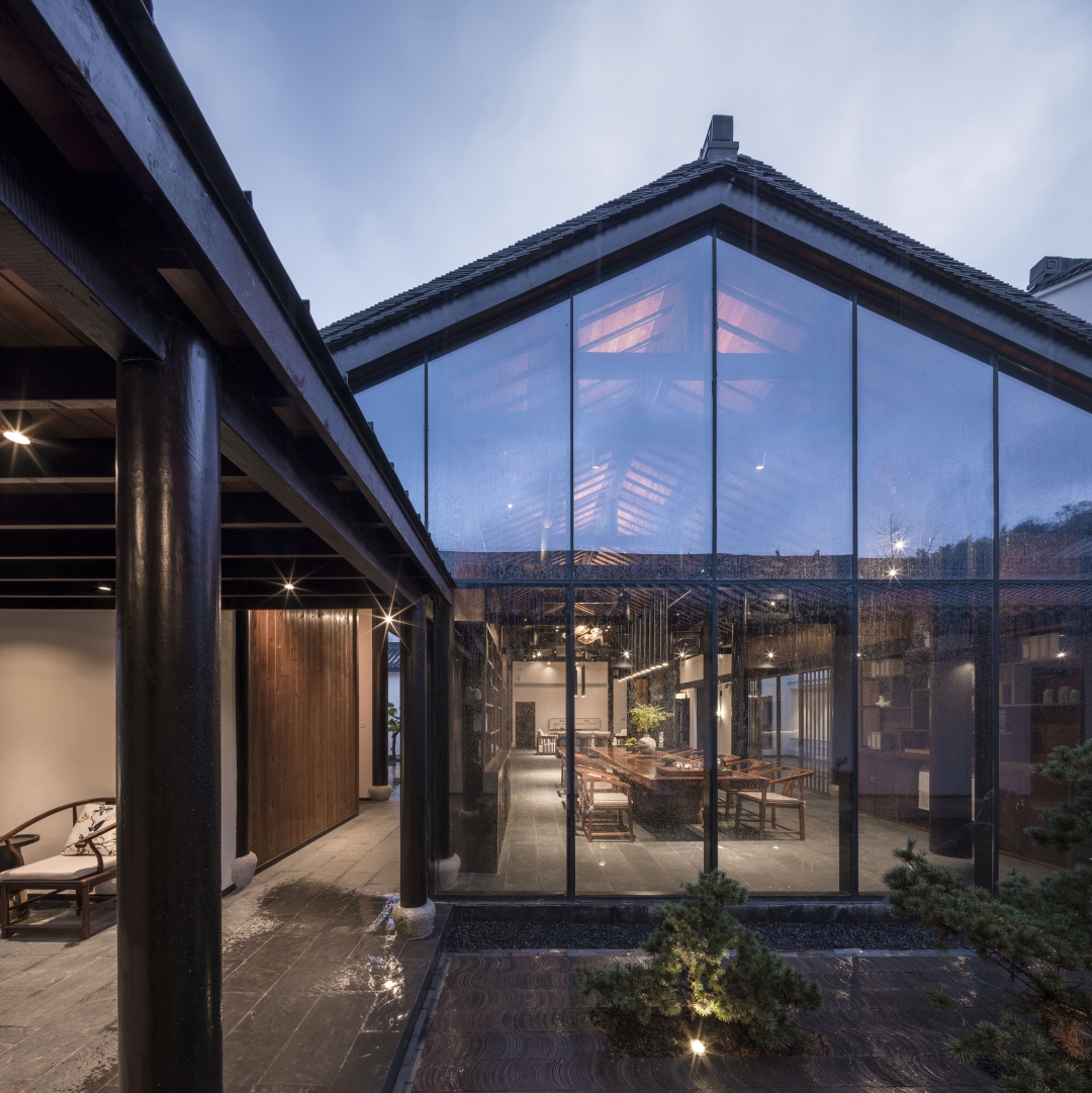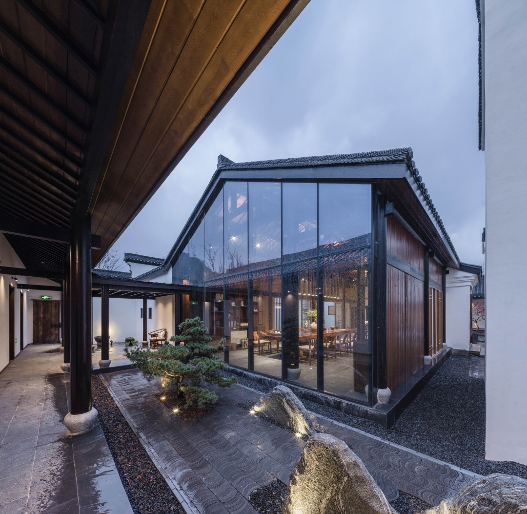 大堂由大幅落地窗與玻璃門圍合而成,以現(xiàn)代手法重構(gòu)通透的視覺效果,庭院的四季變化盡收眼底。即保持了傳統(tǒng)民居的符號(hào)又體現(xiàn)了現(xiàn)代建筑的融合性和一致性,也是地域文化、鄉(xiāng)土文化的一種回歸方式。