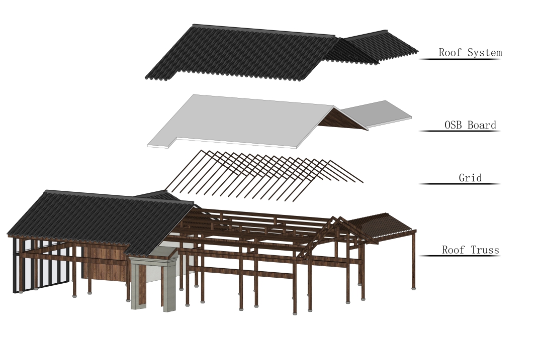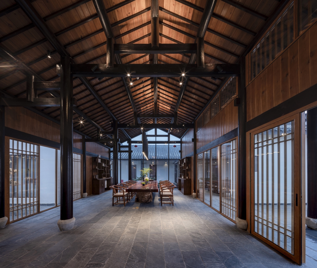 木結(jié)構(gòu)是歷史產(chǎn)生的瑰寶,蘊(yùn)含很重要的歷史和文化價(jià)值,穿斗式木結(jié)構(gòu)又是中國(guó)傳統(tǒng)建筑中最重要的結(jié)構(gòu)形式之一。拆下來的舊木料、舊磚瓦、花瓶式柱礎(chǔ)都被重新被利用,老宅內(nèi)的古樹根據(jù)景觀布局進(jìn)行移植栽種。這次的復(fù)原,運(yùn)用了現(xiàn)代木結(jié)構(gòu)技術(shù),使用鋼構(gòu)連接件替換了傳統(tǒng)的技術(shù),受力可以參與參數(shù)化計(jì)算,結(jié)構(gòu)整體更加穩(wěn)定及持久。