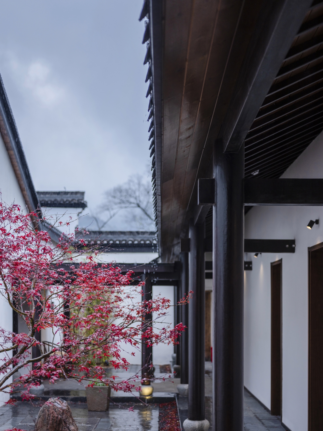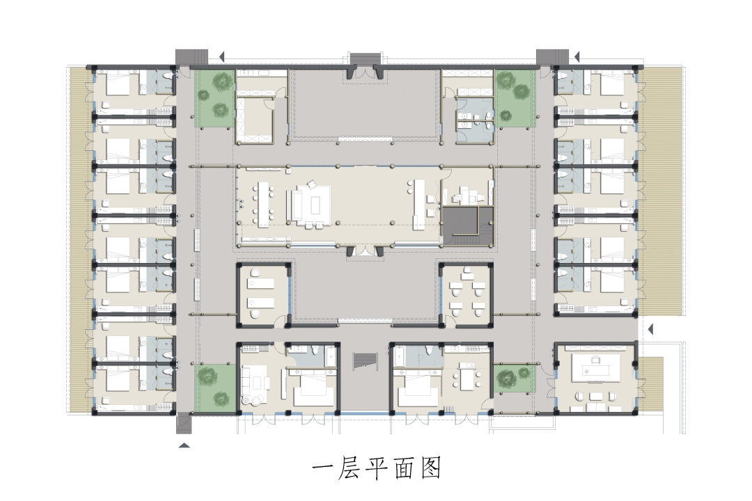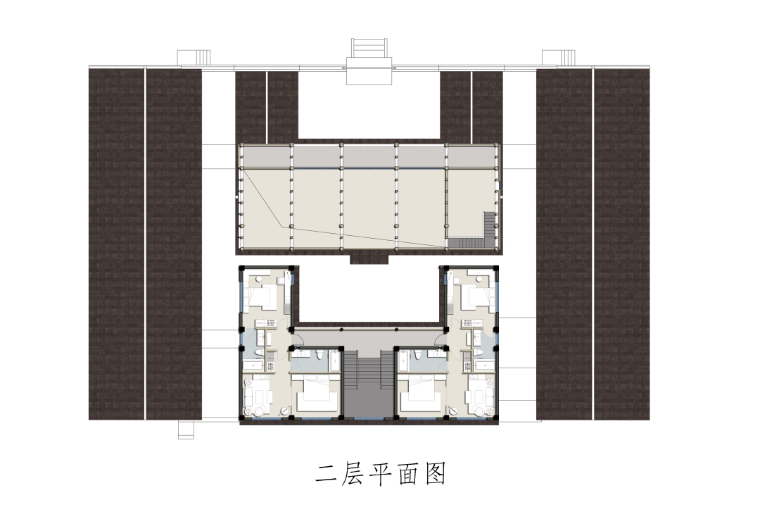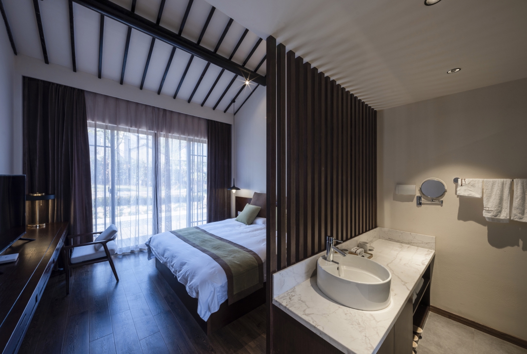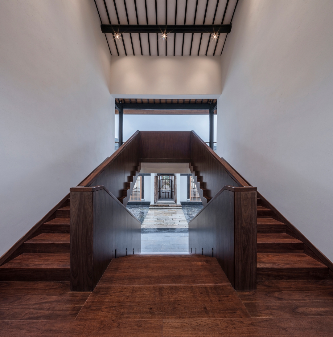 14間客房沿建筑外側(cè)布局,穿插若干景觀庭院,保證每間客房良好的景觀視線。穿過大堂,延木構(gòu)樓梯拾階而上,行至二樓客房??头恳阅旧珵榛{(diào),黑白灰為輔,溫潤(rùn)質(zhì)樸,自然舒適,住客能感受“寶鼎茶閑煙尚綠,幽窗棋罷指猶涼”的詫寂之美。