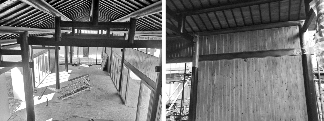 木結(jié)構(gòu)坡屋面采用掛瓦方式,在傳統(tǒng)的掛瓦節(jié)點(diǎn)的木椽條間充填防火保溫層,增加建筑保溫性能,優(yōu)于國(guó)家節(jié)點(diǎn)要求。并在檐口部分增加泛水板,更好的保護(hù)了木結(jié)構(gòu),大大增加了木構(gòu)的使用壽命。