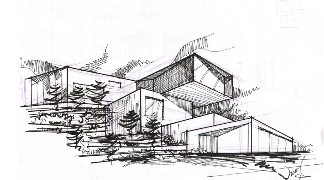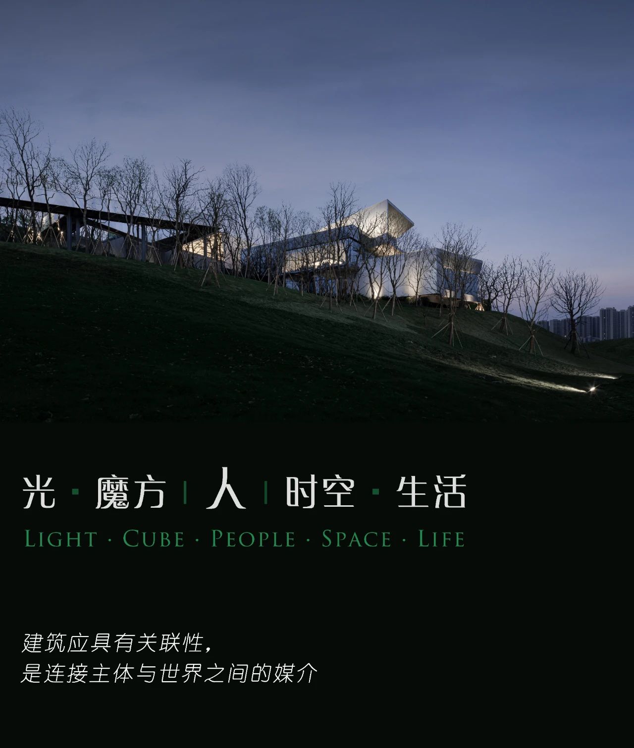 山地建筑之于其他類型建筑不同之處,在于它擁有復雜豐滿的環(huán)境載體,設計必然要回歸本質尋求建筑外部造型、內部空間以及周邊整體地域系統(tǒng)的有機聯系。本案的設計靈感來源于發(fā)光的魔方,它是森林中懸浮的閃光點與記憶點,承載著居者的未來生活,亦是精神場所。