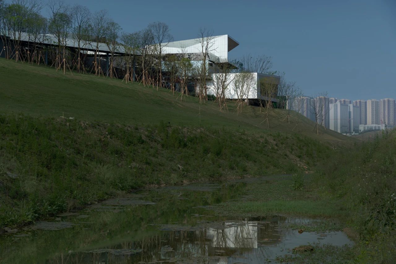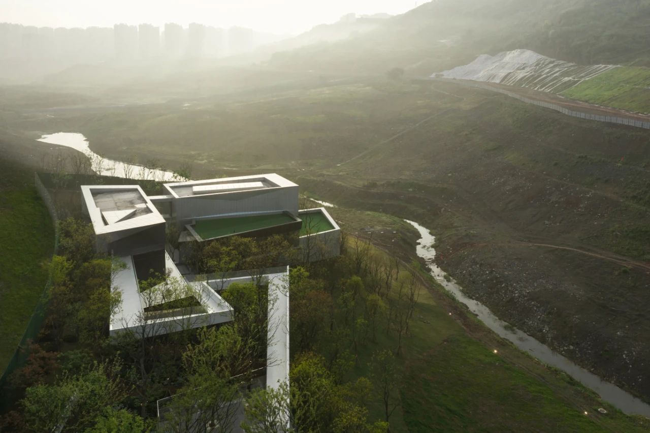 本案毗鄰重慶渝北區(qū)花石溝公園,基地位于小山坡上,設計師讓建筑與環(huán)境和平共處,并不試圖破壞或戰(zhàn)勝它們的直接背景。作為社區(qū)活動中心,希望人們不再仰視它,而是放低視角親自體驗它,這才是建筑的歸宿。