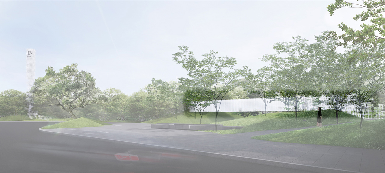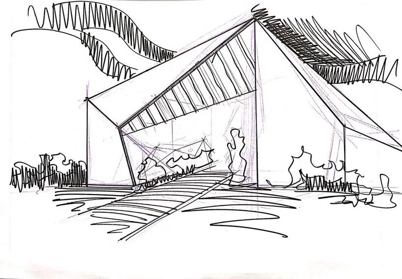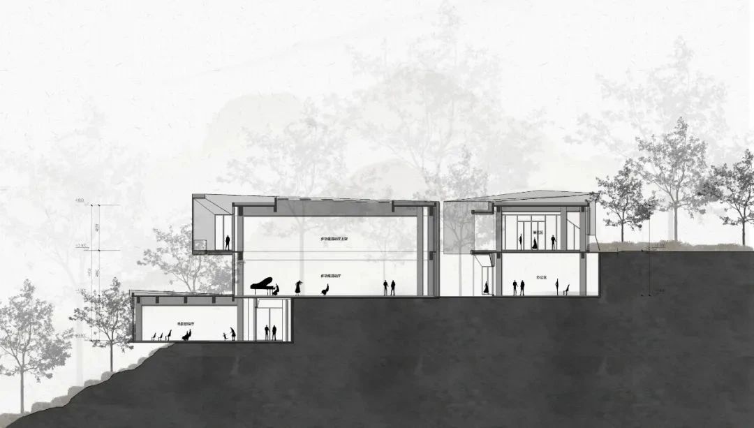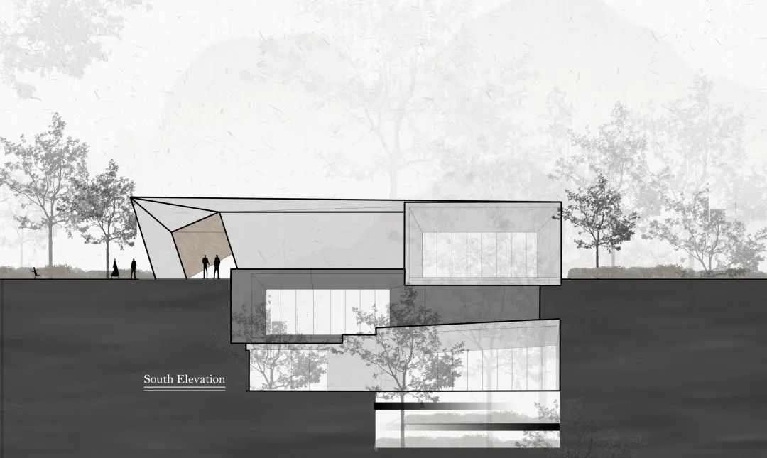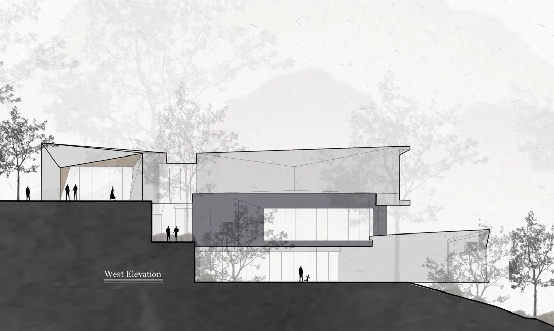 建筑的最底層,為營造出輕盈飄逸的形態(tài),運用懸挑的方式將建筑與山地分開,盡量少的讓建筑介入山體,減少對山地的破壞。設計師希望施工幾年后,植物開始茂盛,建筑將成功的消失在環(huán)境中,這里只有關系存在,沒有形狀存在。建筑周邊種植草坪,人們很容易走上去,建筑造型與地形相結合,也方便舉行各種集體活動。