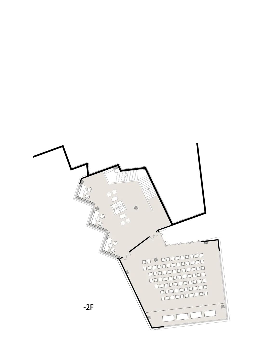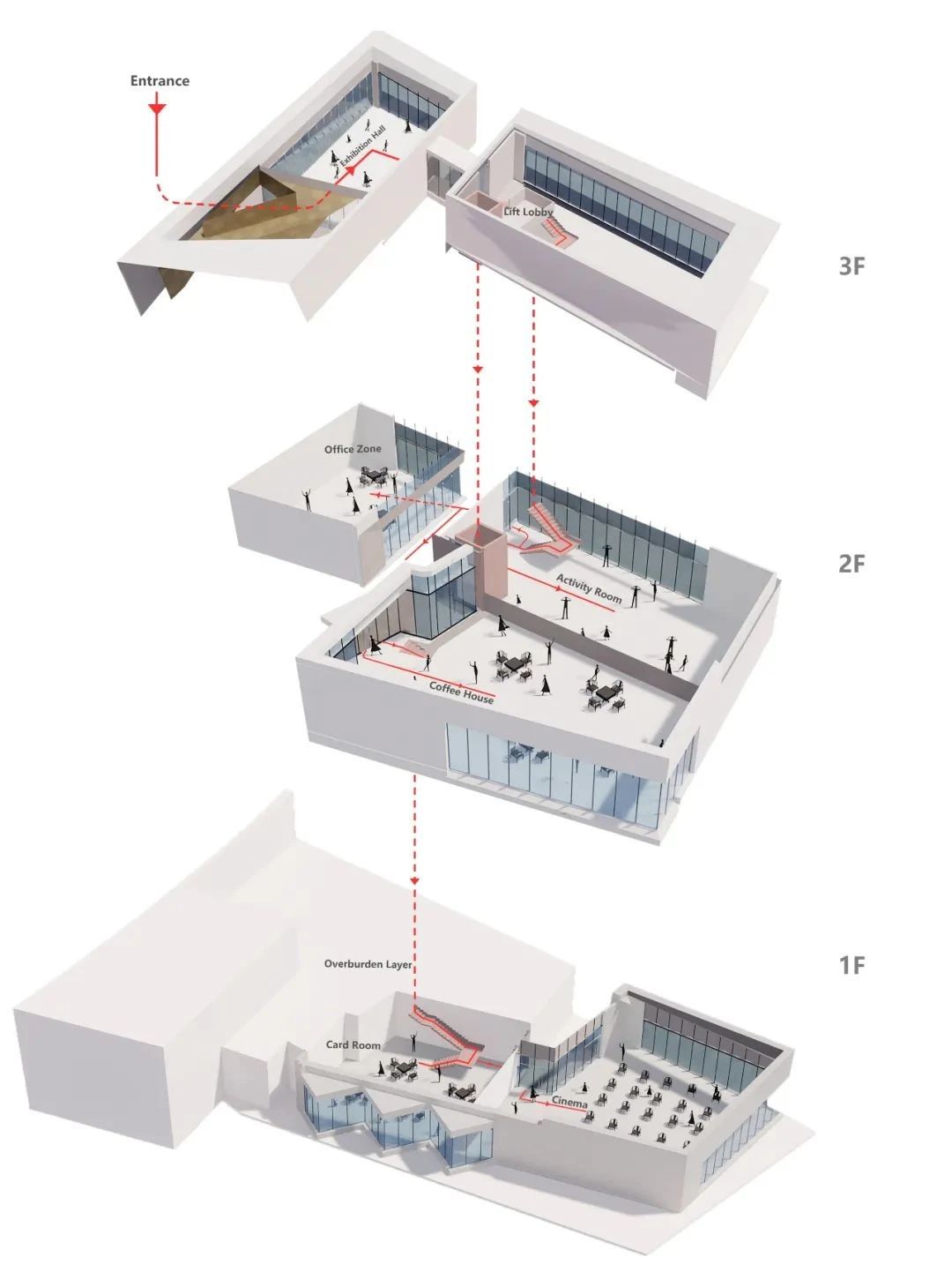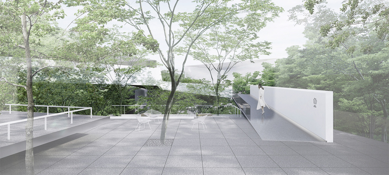建筑的最底層,為營造出輕盈飄逸的形態(tài),運用懸挑的方式將建筑與山地分開,盡量少的讓建筑介入山體,減少對山地的破壞。設計師希望施工幾年后,植物開始茂盛,建筑將成功的消失在環(huán)境中,這里只有關系存在,沒有形狀存在。建筑周邊種植草坪,人們很容易走上去,建筑造型與地形相結合,也方便舉行各種集體活動。