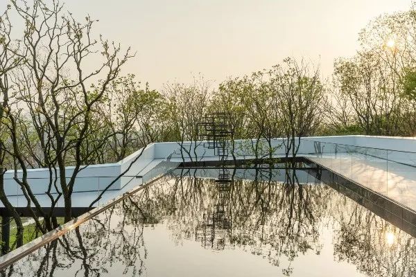 設計師在入口結合開敞空間營造入口口袋公園,通過高低起伏的地形塑造成綠化夾道空間。雕塑般堆砌起的綠丘與隨意生長的樹林,如一片綠色屏障隱晦的傳達出空間的層變,包裹于綠意中的魔方雕塑像一柔白色的光,隱隱約約的引導前來探訪的居客。