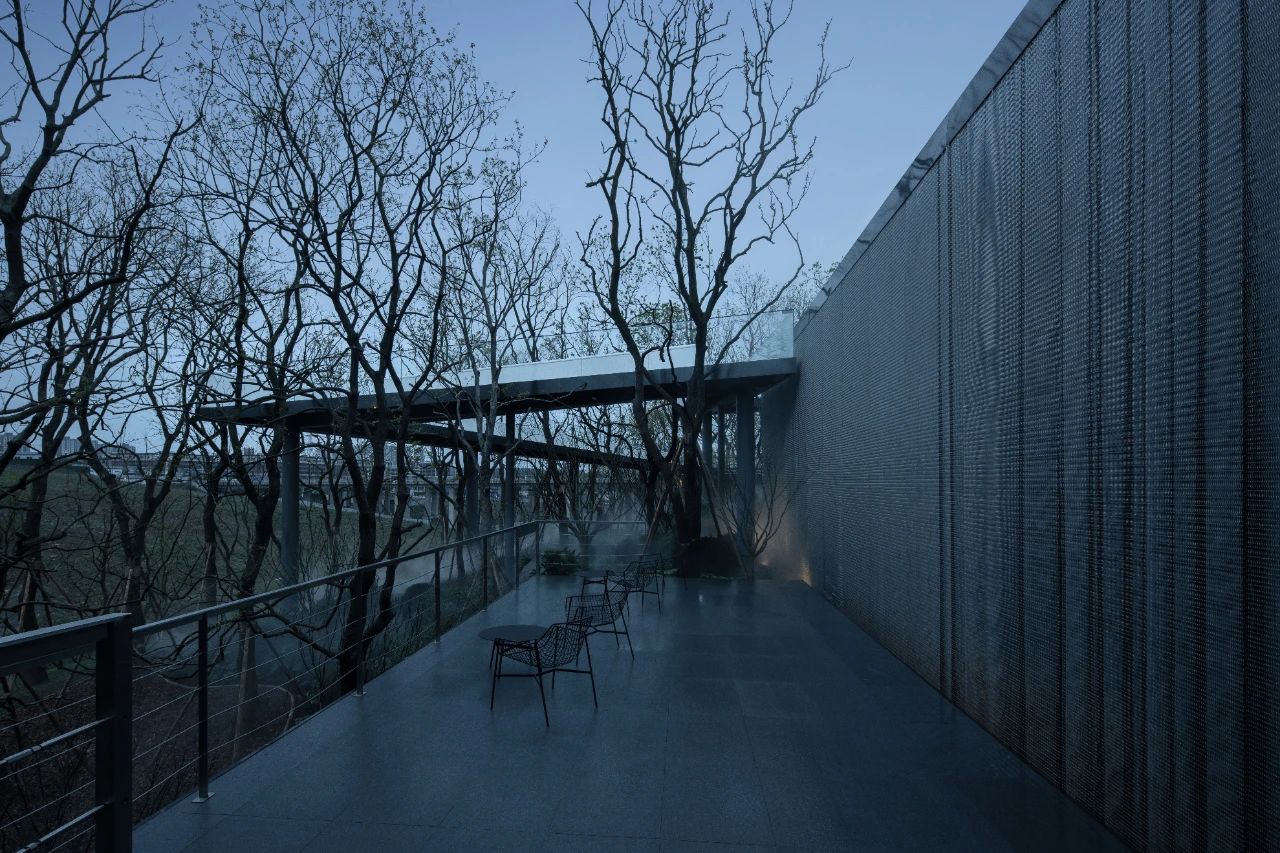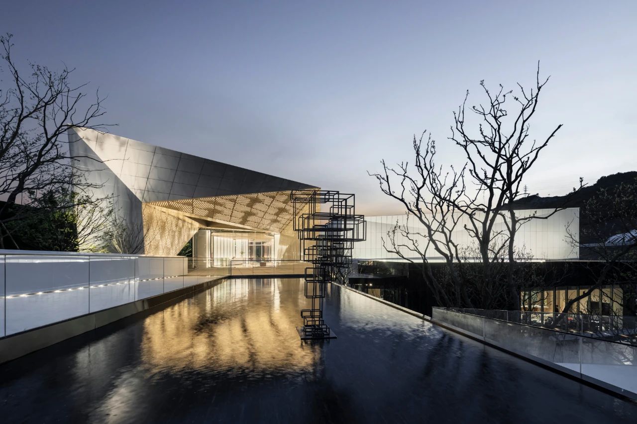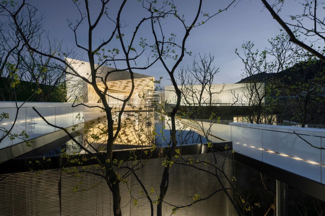 山地建筑設計與場地密不可分,其實質也是追求人與建筑、自然三者的和諧關系。位于上部的三個盒子表皮運用幻彩鋁板,使建筑純潔干凈,但隨著時間流動光線變幻,表皮的顏色也隨之變化,成為建筑表情的有效調節(jié)劑。位于底部盒子設計為黑色鏡面鋁板,匍匐并消隱在山坡之上。金屬表皮映襯著光影下的婆娑樹枝,不再沉悶和堅硬,而是以柔和輕盈朦朧的形象展現在眼前。表皮、空間與光線之間建立了良性的對話,以一種婉約的形式與外部空間聯為一體。