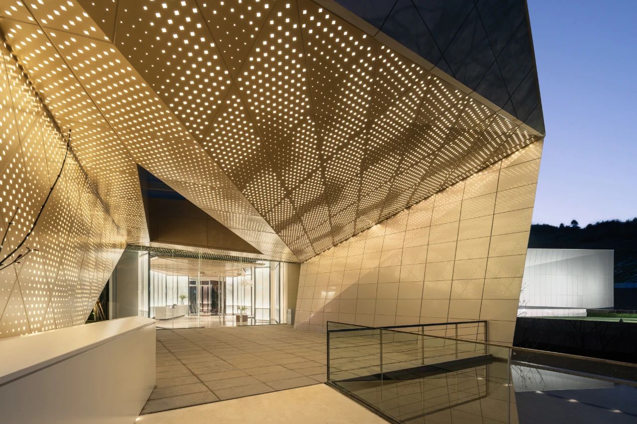 整個建筑共三層,設計師打破尋常流線,使人們從高往低游走。入口的折線造型與星空般的質感吸引著人們走進建筑,通過一條長廊走向盒子中。內部兩層通高的空間,瞬間給人一種豁然開朗的體驗感。動態(tài)的設計過程決定了形式的動態(tài)特征,給予空間更多的流動性。