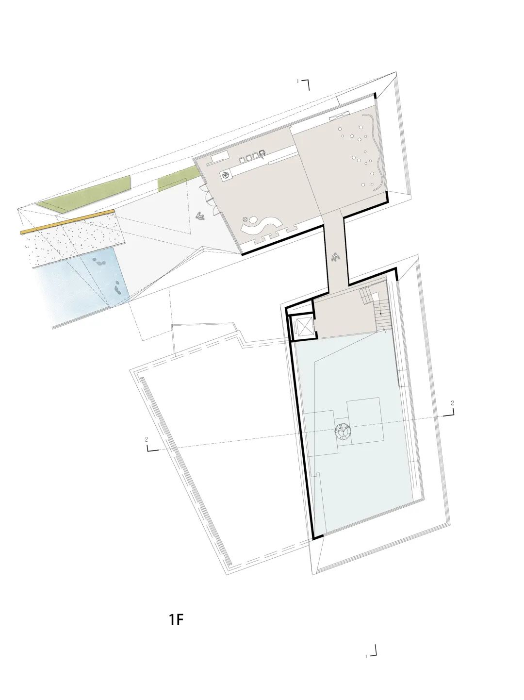 折疊形成的庭院,使內部空間秩序不再固定,在流動的空間中,空間互相穿透與交融,界限曖昧模糊。建筑內外相互流通,個體空間的形態(tài)也退而求其次,讓步于整體的空間關系。建筑空間具有連續(xù)性,形成一種漫游。