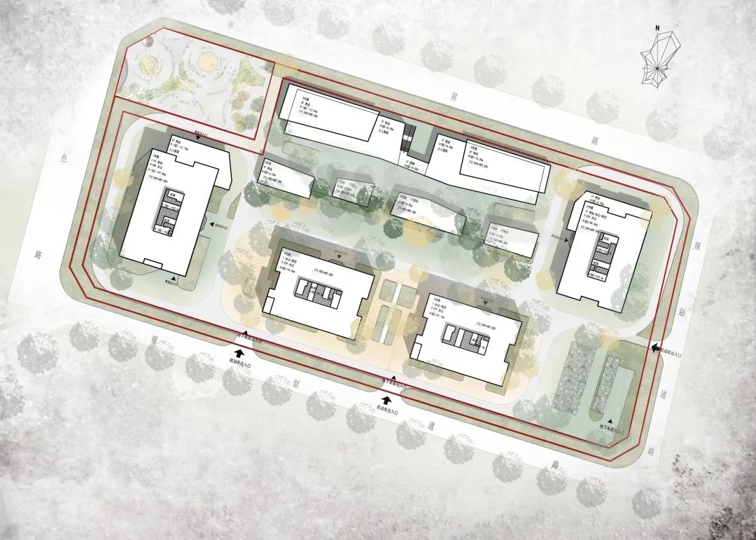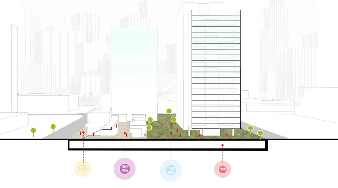 基于場(chǎng)域現(xiàn)狀,設(shè)計(jì)師提出“開放社區(qū)生態(tài)圈”的設(shè)計(jì)構(gòu)思,以人的感受為第一出發(fā)點(diǎn)。將地塊劃分為4棟塔樓,并在塔樓組團(tuán)散置破碎化商業(yè)配套,激活場(chǎng)地與周邊溝通的可能性。沖破道路對(duì)地塊的界限,打造更加開放宜居的場(chǎng)所。