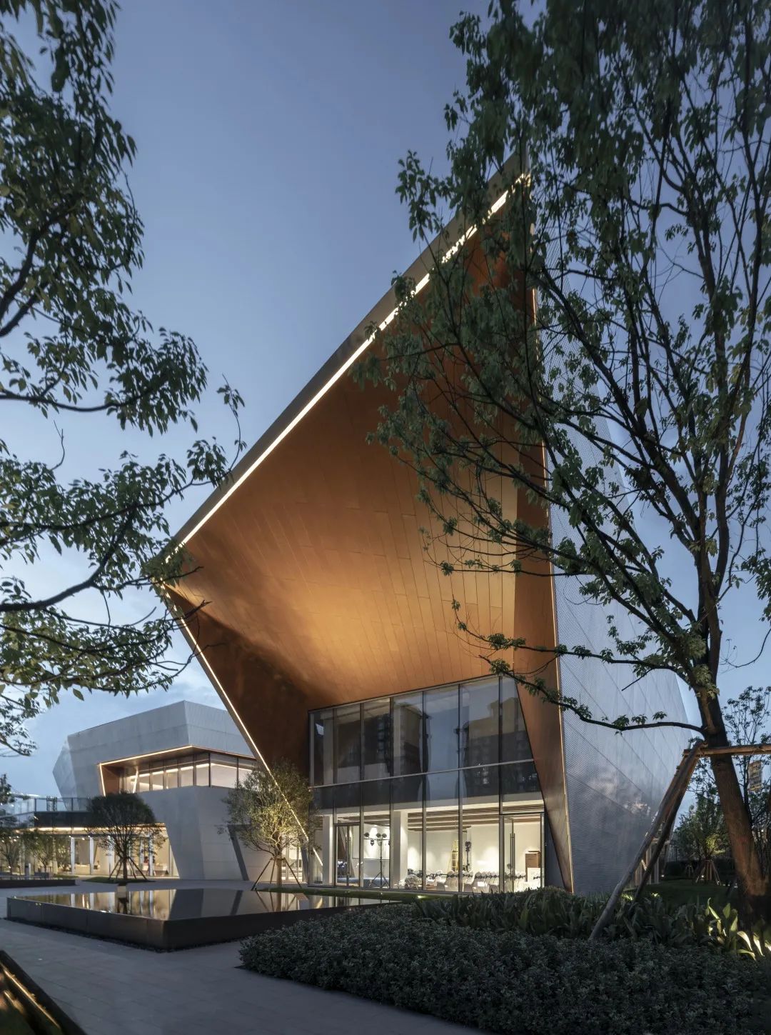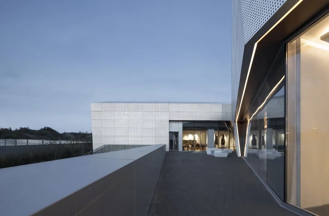 為了在夜晚照亮周界與廣場,將建筑通透的玻璃面置于一層,實體的金屬面置于二層,激活了內(nèi)外部的行人體驗。立面上僅使用3種建筑材料,純凈表皮最大化展示形態(tài)美。