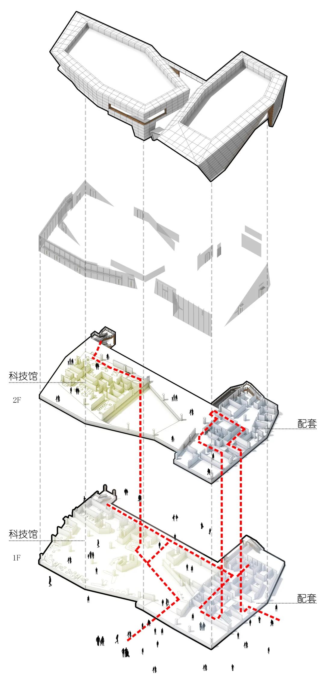 本案建筑形態(tài)就好似一個具有未來氣息的“宇宙飛船”。而建筑空間的打造,則進一步強化“宇宙飛船”的教育意義。本案具備科技體驗館及社區(qū)中心兩種功能,相應(yīng)的場館也因此劃分為一層相連,二層獨立的兩部分。