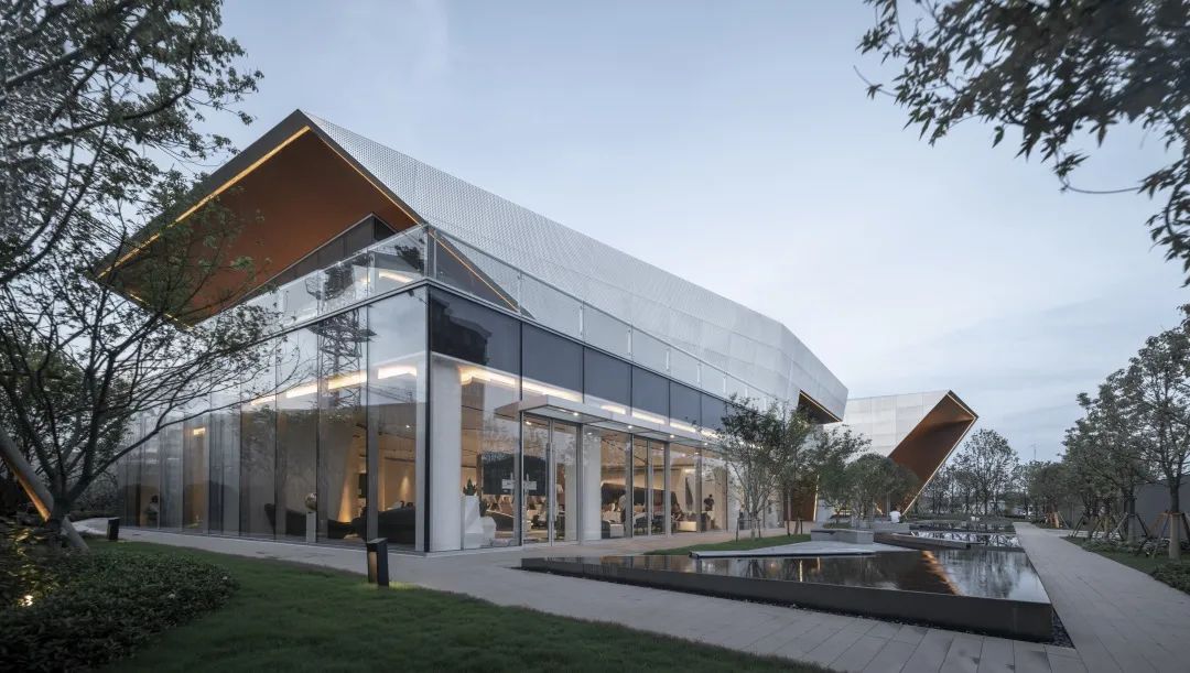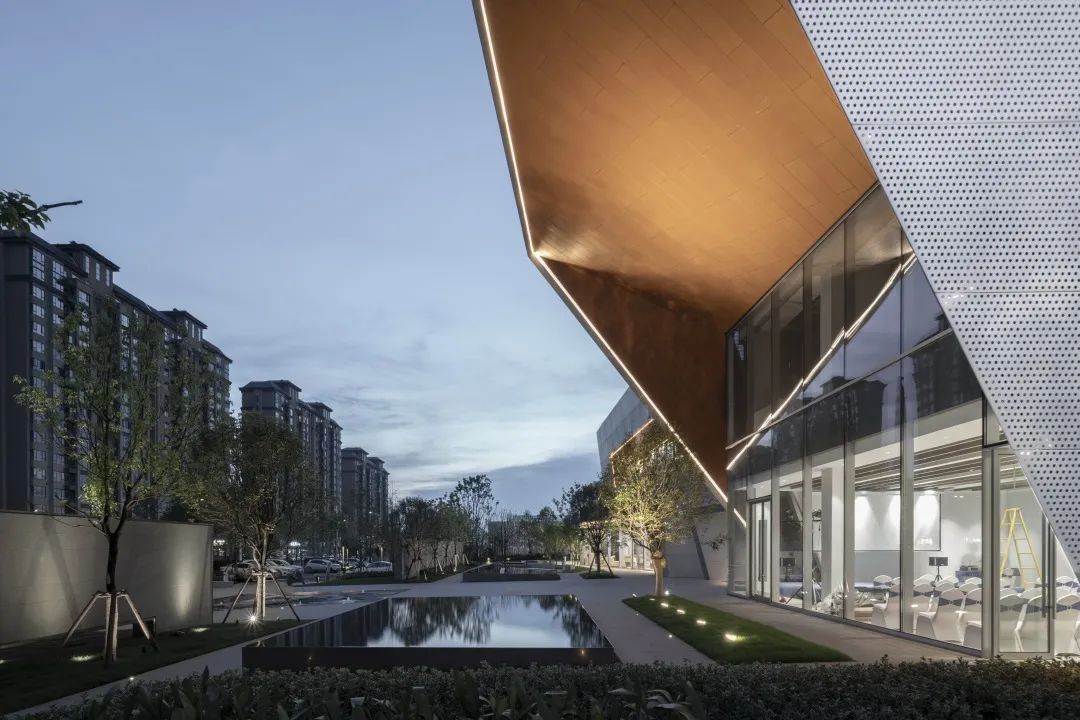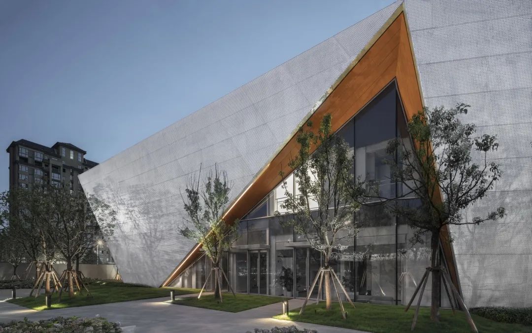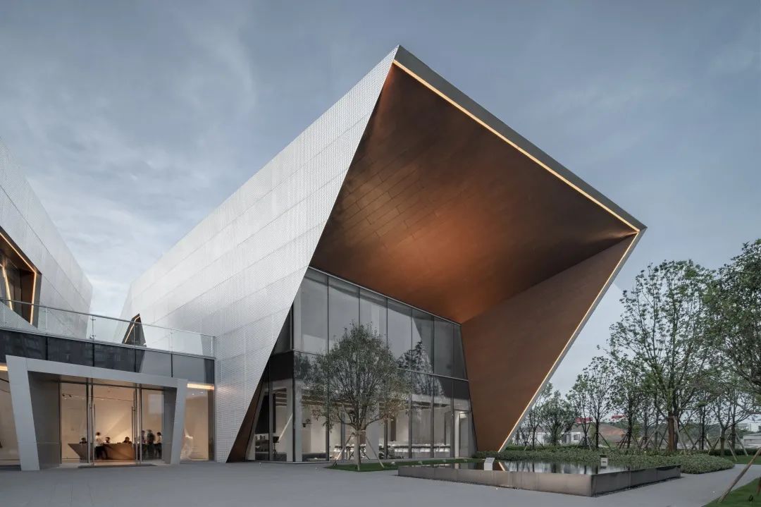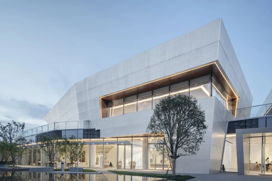 通過對體塊的切割,形成前衛(wèi)現(xiàn)代的建筑形體。大面積穿孔鋁板、仿木紋鋁板和玻璃體塊的結(jié)合,使得整體形象極富張力和工業(yè)美感。