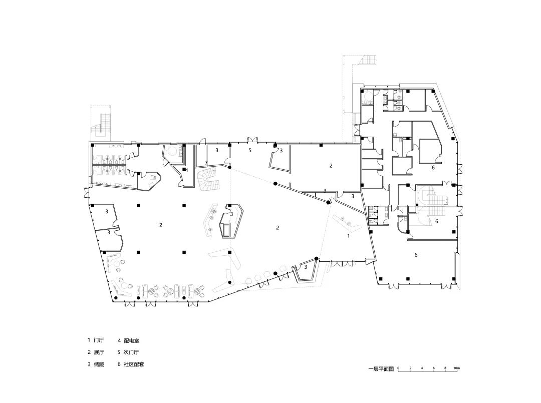 建筑兩部分的轉(zhuǎn)角開口,形成了一個梯形的入口廣場。由此進入經(jīng)過門廳,來訪者可以順著幾何空間不斷向上,參訪兩層的各個主題展廳。展廳的主題則主要關(guān)注于科學(xué)和技術(shù)相關(guān)的內(nèi)容,并設(shè)置了可供年輕游客參與的互動裝置,寓教于樂。