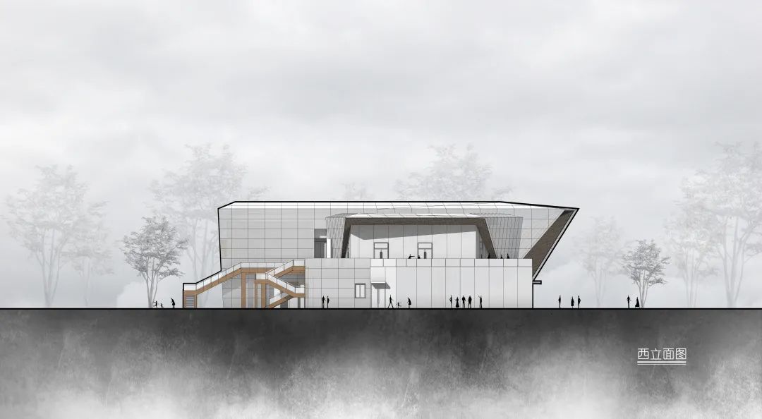 在二樓兩個體塊間預(yù)留預(yù)留露臺空間,來訪者可以到達建筑的屋頂露臺,從而欣賞萬豐湖濕地公園的全景風(fēng)貌。并于露臺預(yù)留架設(shè)天文望遠鏡的空間,游客可于此仰望滿天繁星。