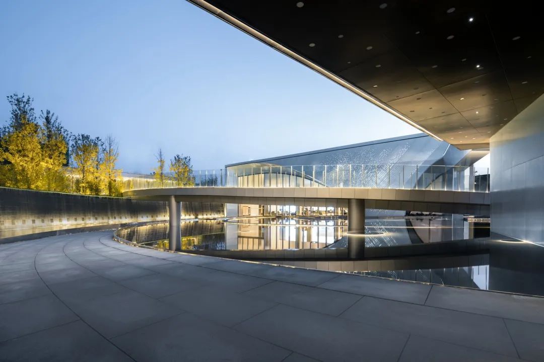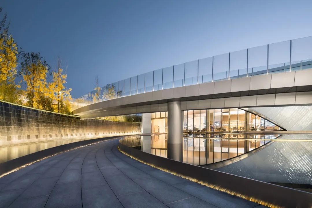 空間與視覺的連續(xù)性:立面的墻體通過藝術(shù)創(chuàng)作產(chǎn)生視覺上的肌理感,將光與影帶入到空間中,微風(fēng)拂過水波倒影連廊起伏,層層漣漪之上倒映出朦朧的樹影與建筑。運(yùn)用玻璃等半透明材料,舒朗別致的造型結(jié)構(gòu)打破景觀與建筑的界限,打造空間與視覺的連續(xù)性與純凈性。