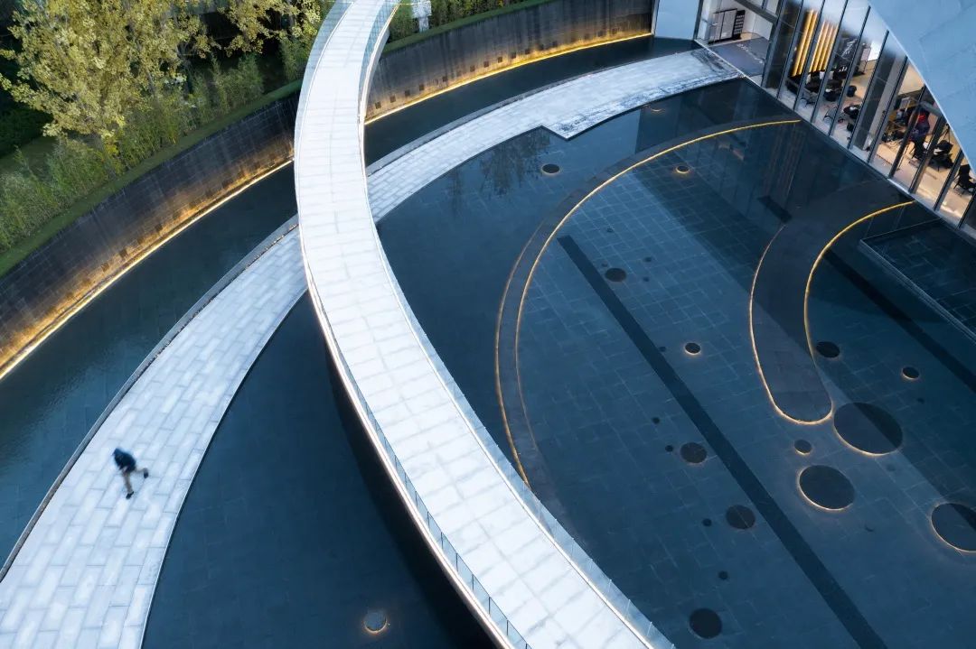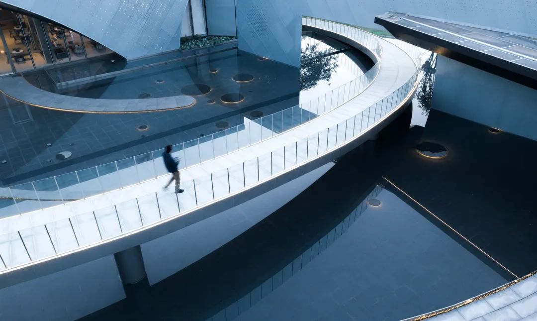 曲線形和方形的空間,與景觀的廊橋相互回應(yīng)。建筑立面的曲線與景觀廊橋的曲線延續(xù)統(tǒng)一,這是一條隱性的認(rèn)知流線——向上、向內(nèi)、向光,懸隔日常,劃過銀河,回歸自我。