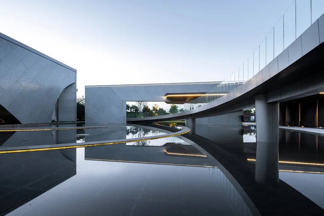 獨(dú)特的示范區(qū)入口門頭設(shè)計(jì),三角形交錯(cuò)切割搭的頂蓋搭配弧與圓變形拼接的墻體,選用與建筑表面相同的鋁板材質(zhì),讓每一個(gè)到訪的客戶都能體會(huì)到尊貴大氣的儀式感。大門整體框架為線條設(shè)計(jì)感十足的多邊幾何形,肆意張揚(yáng)的角,似無限延伸的線,百變的面富有動(dòng)感?!坝薄ⅰ熬邸?、“觀”一氣呵成。整體為黑白色調(diào),純粹簡約,同樣不缺少高級(jí)質(zhì)感。從內(nèi)延伸至外的水面,倒映著藍(lán)天白云,似天地顛倒闖入一片幻境,似夢(mèng)而非夢(mèng)。