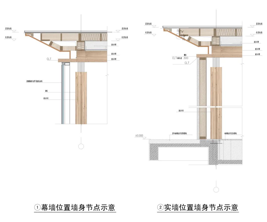 在兼顧立面效果和結(jié)構(gòu)強度的同時,屋頂與幕墻、實墻的連接處,技術(shù)團隊創(chuàng)新性地采用頂部檐口做薄覆以斜面CLT的方式。既解決了檐口裝飾,又解決了幕墻收口,并于結(jié)構(gòu)形成的凹槽處設(shè)置燈帶,美化了建筑夜景表現(xiàn)。
