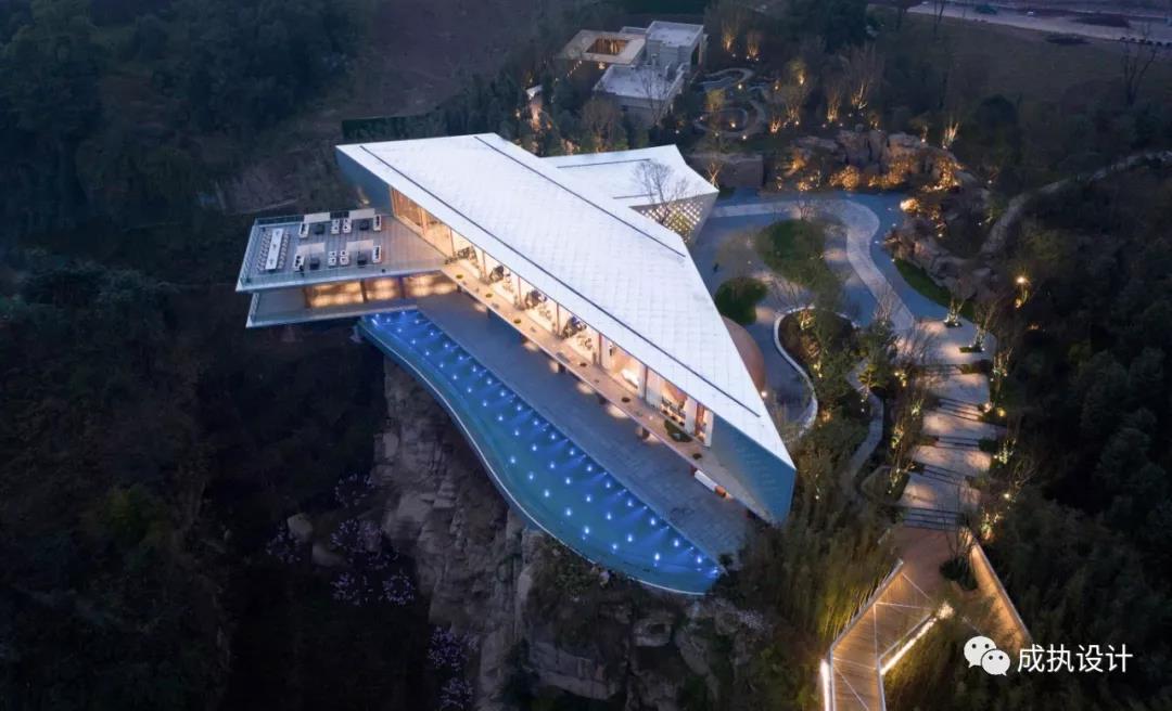 御臨府項目如仙鶴一般傲立于懸崖之上,順應(yīng)地形,并最大化利用景觀資源。菱形格構(gòu)強調(diào)空間的連續(xù)性。表皮采用參數(shù)化設(shè)計,精確控制每塊鋁板的折角變化。