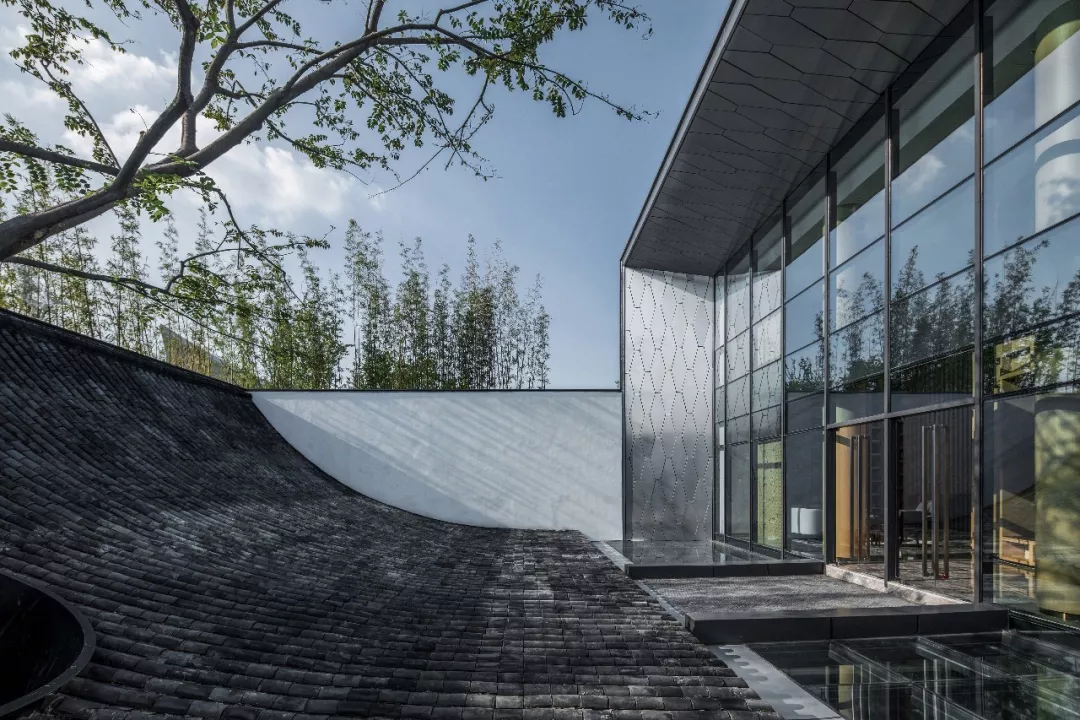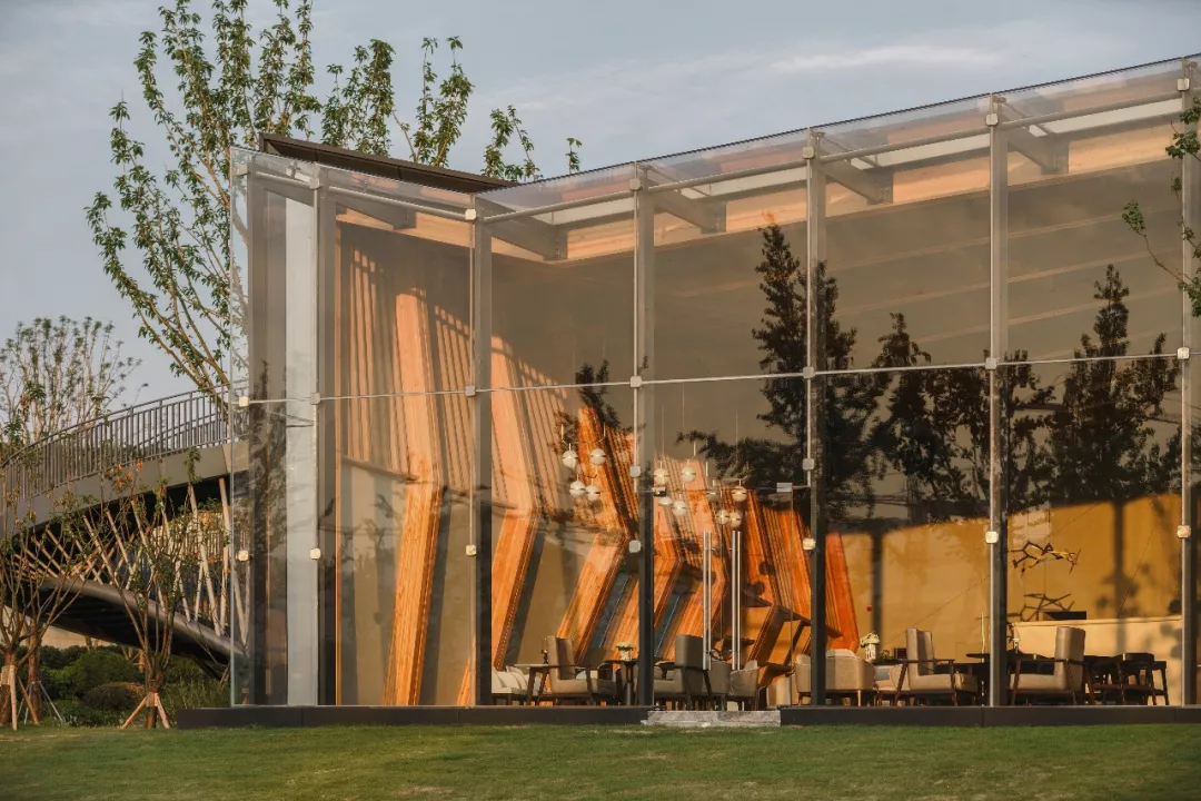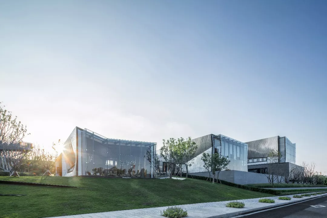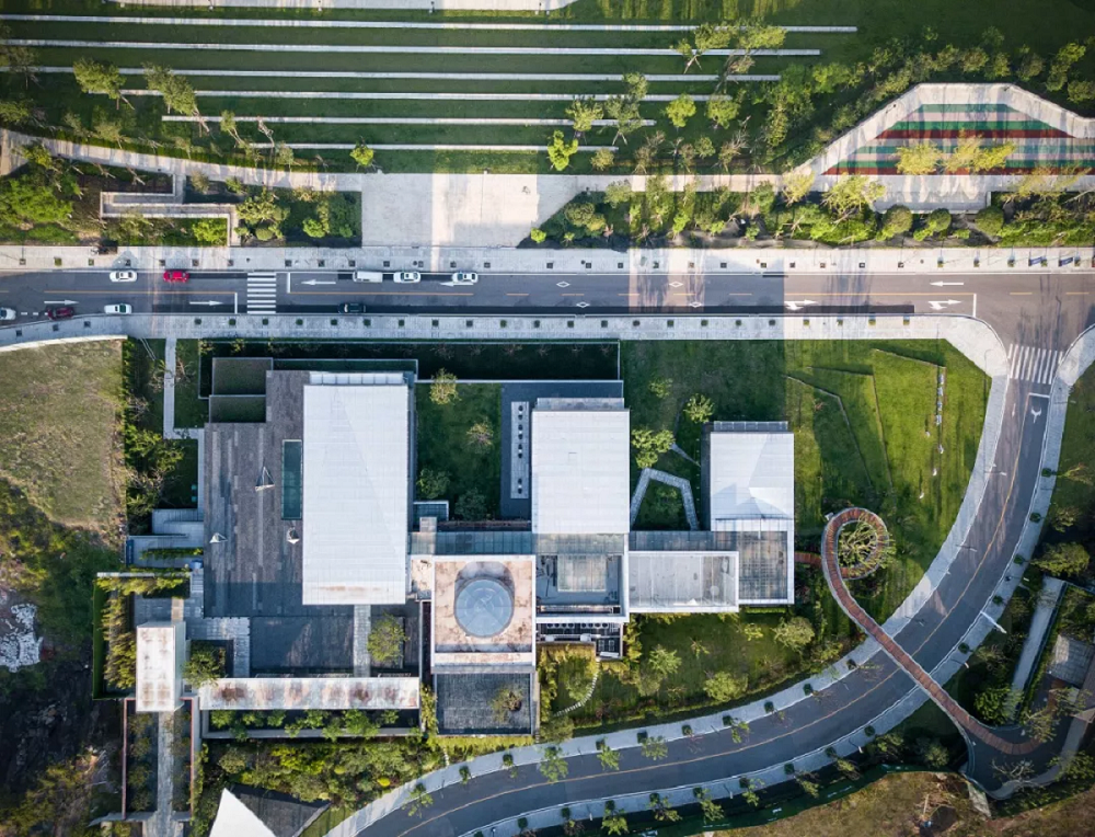 重慶龍湖原麓社區(qū)中心毗鄰龍興古鎮(zhèn),御臨河邊,有遠山起伏。作為對當(dāng)?shù)匚幕c場地環(huán)境的回應(yīng),成執(zhí)設(shè)計在建筑中植入中國傳統(tǒng)建筑的文化元素,并以群落化的布局與穿插其間的庭院,重塑坡地中的場地環(huán)境。