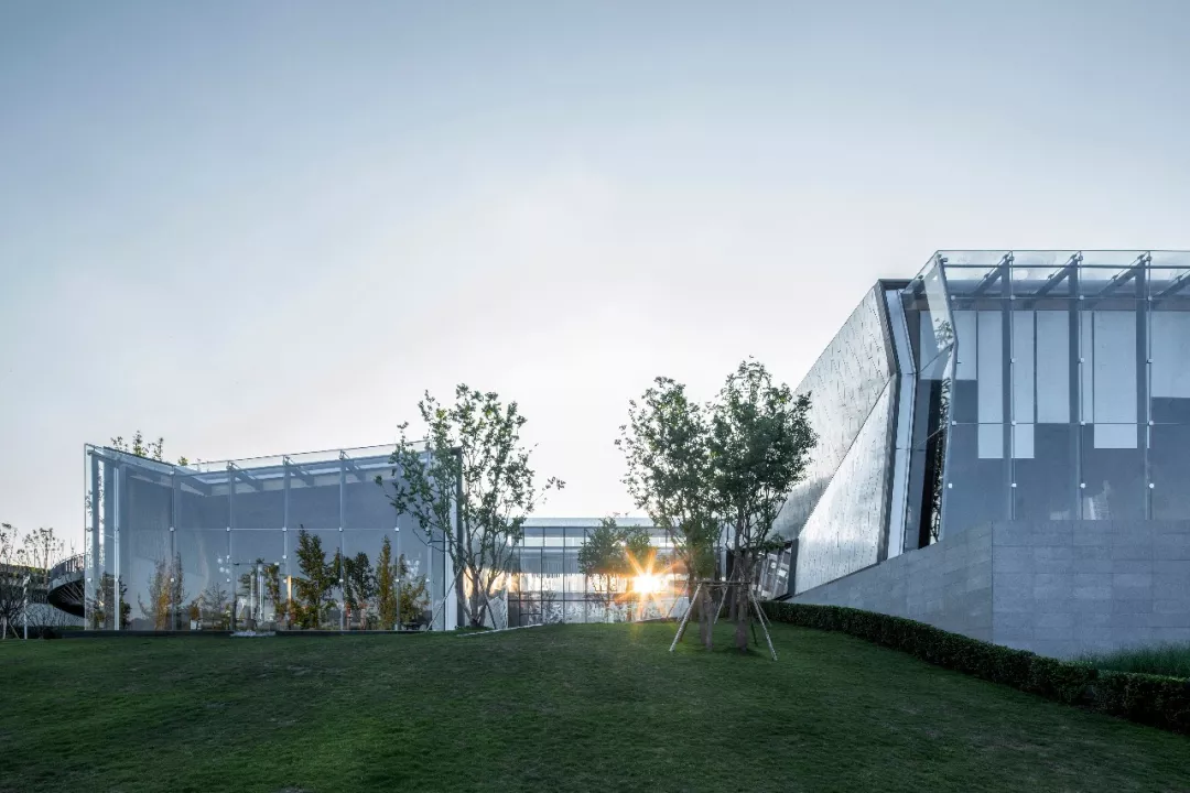 項目位于平緩的坡地上,遠山與河流成為設(shè)計自然依托的環(huán)境條件,李杰希望賦予設(shè)計以山地建筑群落的形象,而這也是場地環(huán)境所帶給他的最真實的感受?!吧缴系氖サ睢俺蔀樵O(shè)計最初意圖營造的空間效果,建筑以臺地的形式與場地環(huán)境相融合,三個形式純凈的體塊以線性排列的方式朝向遠方,呈現(xiàn)出存在、感知與冥思的意味。在設(shè)計中,文化、自然、人文與建筑相互交織,這是李杰一貫秉持的設(shè)計原則,在他看來,任何一個方面都不能剝離,只有這樣的建筑才是最有生命力的建筑。