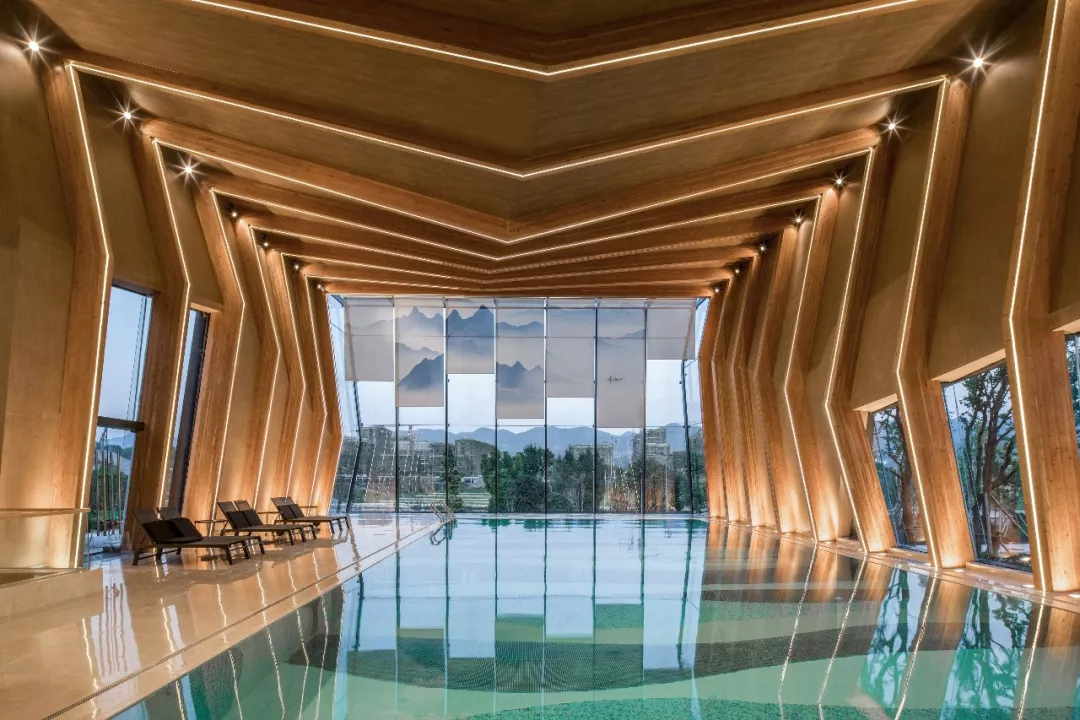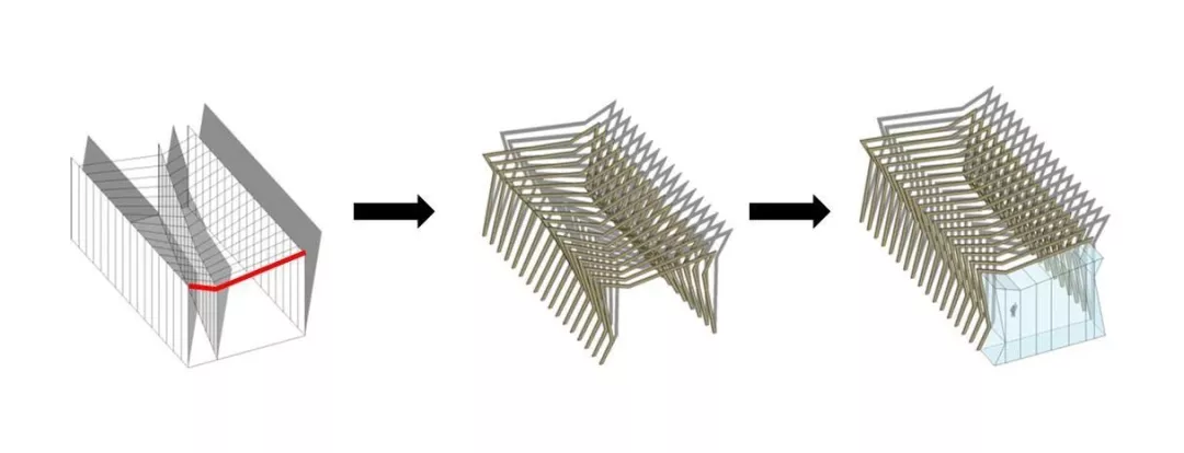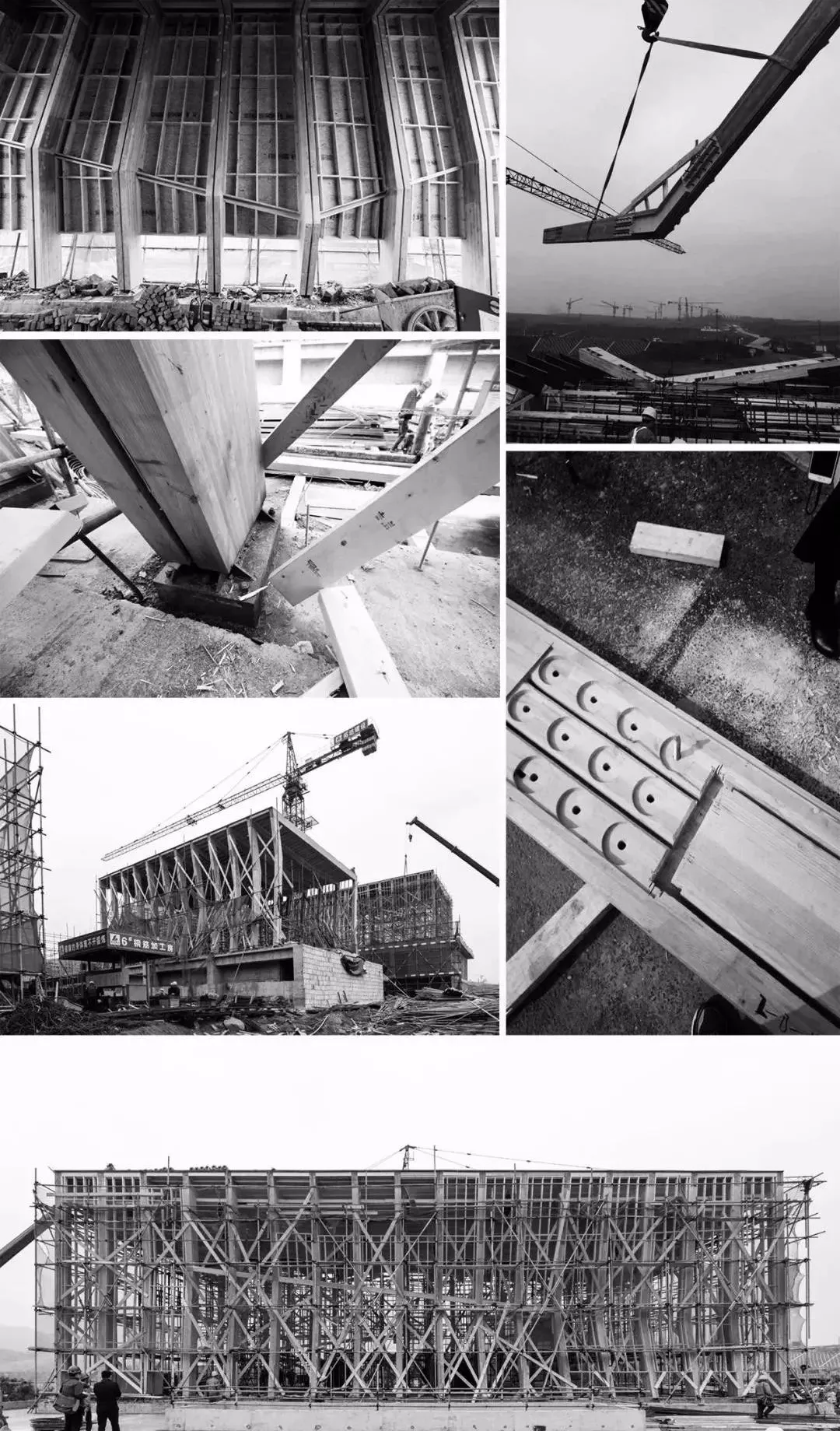 通過木材預(yù)制,木構(gòu)折線的搭接干凈利落,塑造出傳承傳統(tǒng)折坡屋頂?shù)膬?nèi)部空間,同時又呈現(xiàn)出表皮上的灰色壓紋的漸變,完美實現(xiàn)了表皮貼合形態(tài)的設(shè)計要求,而且大大縮短了施工周期。李杰談到,一體化的施工方式將成為中國未來設(shè)計與建造的主流手段。