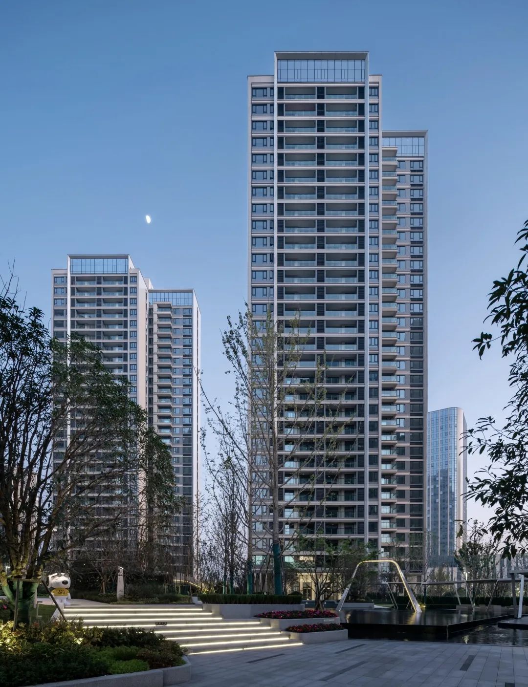 項目毗鄰龍興古鎮(zhèn),御臨河邊,有遠山起伏,綠化集中,東側(cè)景觀極佳,而其余方向則乏善可陳。作為對環(huán)境的回應(yīng),建筑師將三個體量不同的盒子并列于山坡上,垂直于濱河道路,以期達到濱河景觀及遠山的最佳觀賞。通過建筑與環(huán)境的互塑共生,使遠山、河流、庭院、建筑重塑構(gòu)成新的秩序,營造獨有坡地特征的建筑群落。